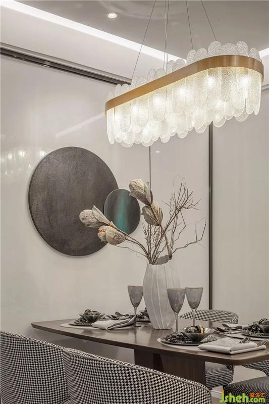 低调内敛的墨绿色布艺皮革拼接沙发搭配舒适的千鸟格图案单椅,缔造出优雅奢华的家居质感。丰盈的花艺生机勃勃,整个氛围如室外穿透纱帘的阳光那般地柔和。沉浸其中,在现代理性中透射出人文艺术的温度。样板房设计