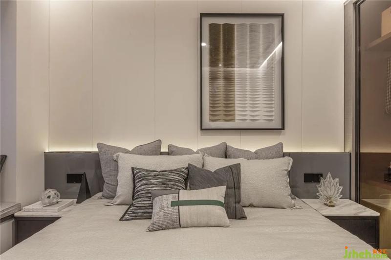 整体空间几乎全由低饱和度的颜色组成,灰色为肌底,予人舒适静谧的视觉感受,祖母绿的运用与精致的装饰画成为贯穿于空间中的艺术力量,立于沙发之后的装饰画如同置身于南京满城的金色梧桐之中,点亮空间视觉。样板房设计