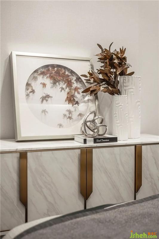 主卧背景墙挂画正如同夏日梧桐树影婆娑,与电视柜上的艺术画和黄色梧桐叶花艺形成了有效的视觉呼应。
