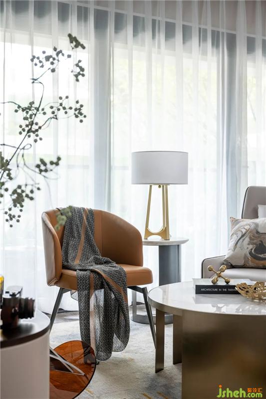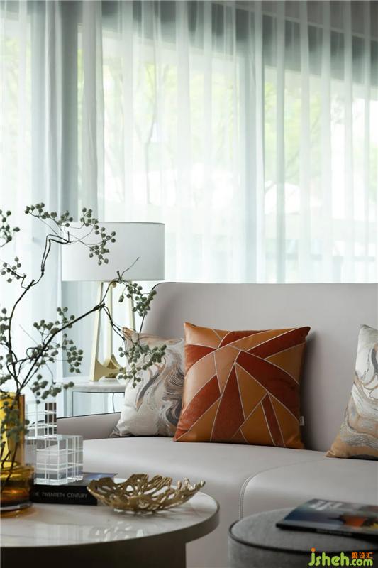 The precious and beautiful sunlight, the natural elegance, and the bright and atmospheric floor-to-ceiling windows make the whole space look particularly harmonious. The space is wide, the decoration is simple, follow the "less is more" design principle, and use the blank to create the charm. The combination of plain white and light coffee on the sofa looks noble and calm, and the integration of orange gives the space a more advanced and enthusiastic.