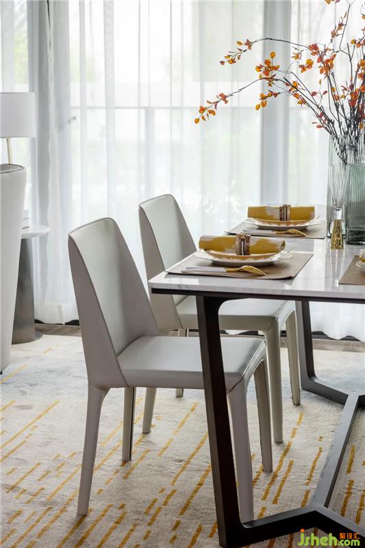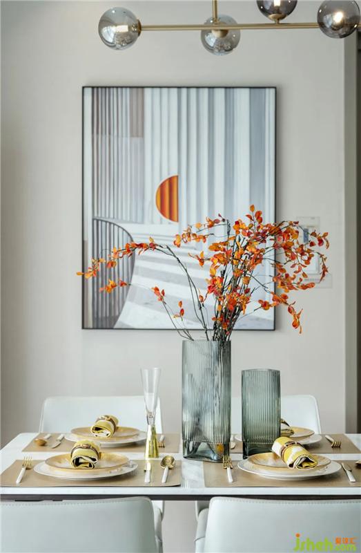 大理石餐桌、高级灰花器、玻璃酒杯、透视强烈的装饰画都在向我们诉说屋主人的优雅与品味,入世但是脱俗。