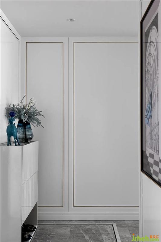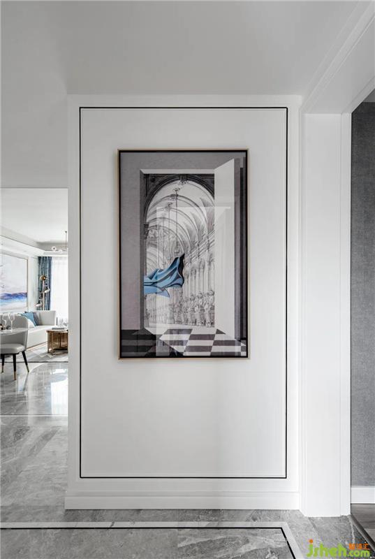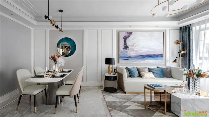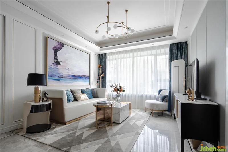 空间延续了硬装的暖灰色,现代简约白色的护墙板,室内设计师选择了灰色大理石地面和米色电视背景墙,让整个空间更加优雅、硬朗、大气,营造现代奢华感。