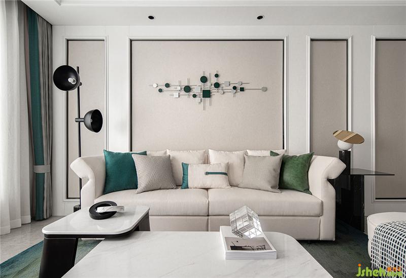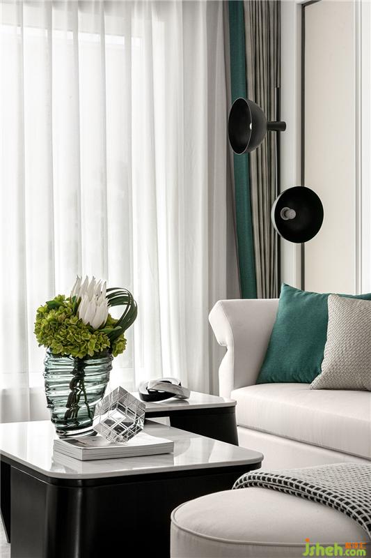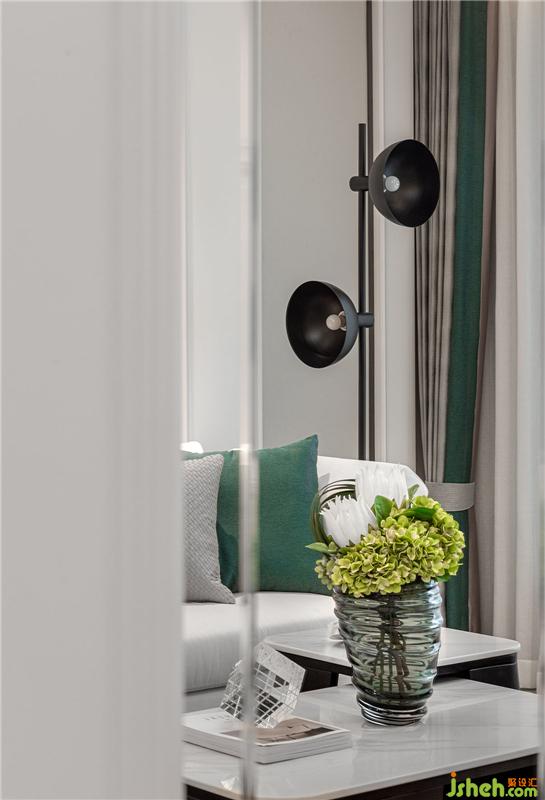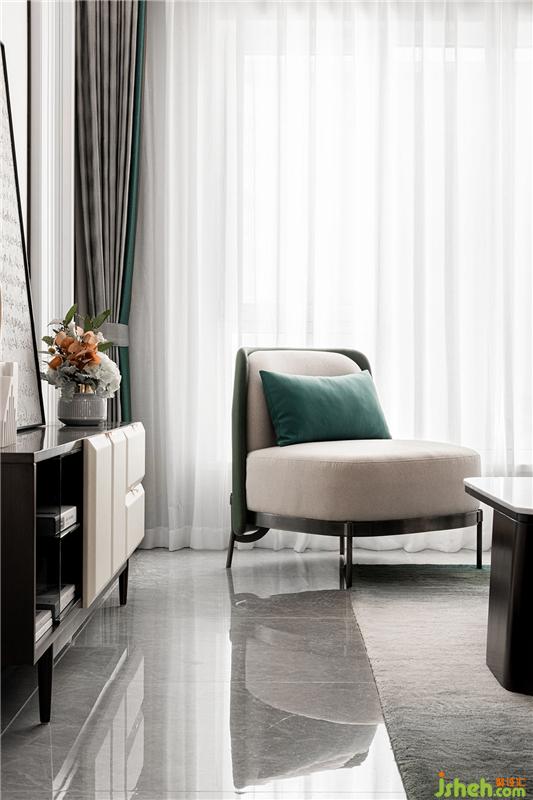 样板房设计希望通过光、空间、材料之间的微妙感官,形成一种当代生活美学。空间深浅不一的灰与白作为基调,以绿色作为点缀,线条明朗而直接。