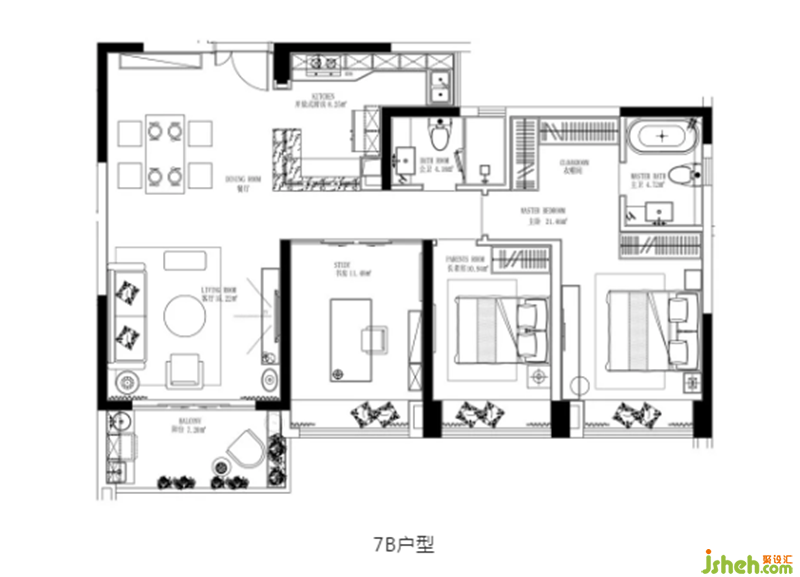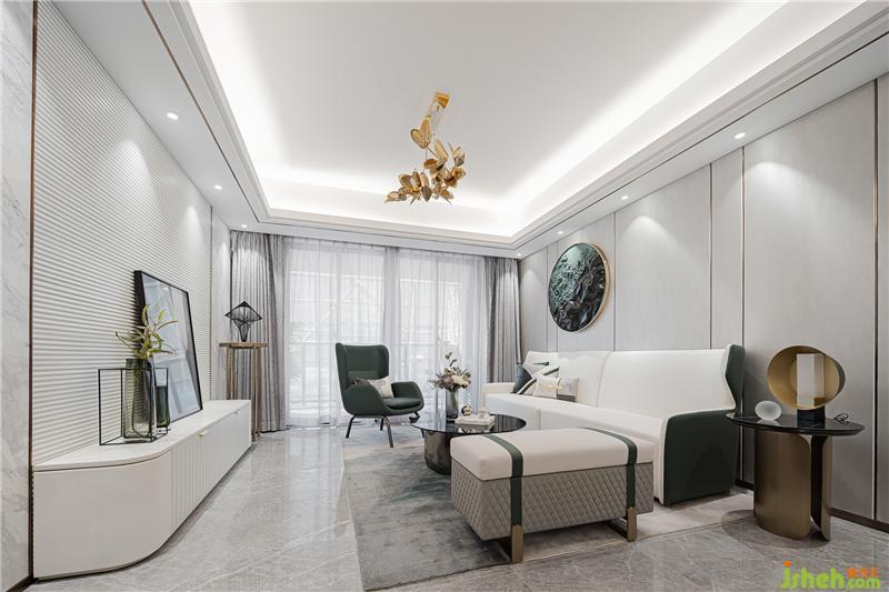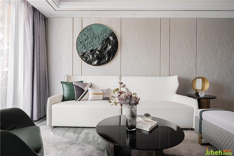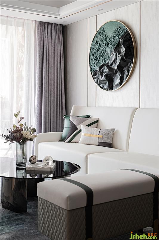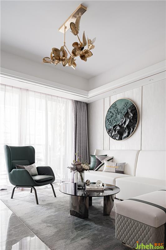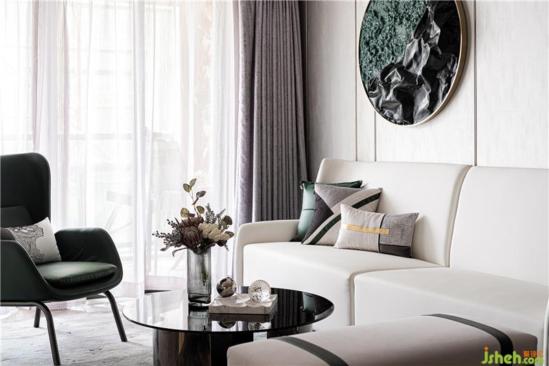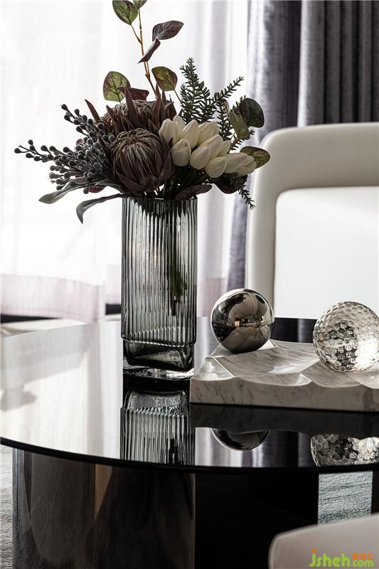 7B户型样板房设计依旧以中性的黑白灰为主色调,搭配点缀现代感十足的香槟金色,空间的颜色层次丰富又显时尚优雅。材质以木材、金属及优质的皮料、柔顺的布艺构成,从材料上把控整体软装的品质。