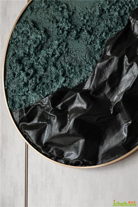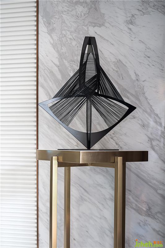 挂画均采用新型复合材质进行制作,不仅仅是美观,更像是新时代的一种标志,就如同中山这座城市:急速发展,欣欣向荣。由于男主人设定为建筑设计师,雕塑我们选用了 Naum Gabo 的作品,它像一个解构建筑,从侧面体现了男主人的职业。Naum Gabo 是一位解构主义雕塑家,采用“立体测量法”的手法建造不同的雕塑,这是他从建筑设计中引用的几种技术之一,为解构主义的发展做出了重要贡献。