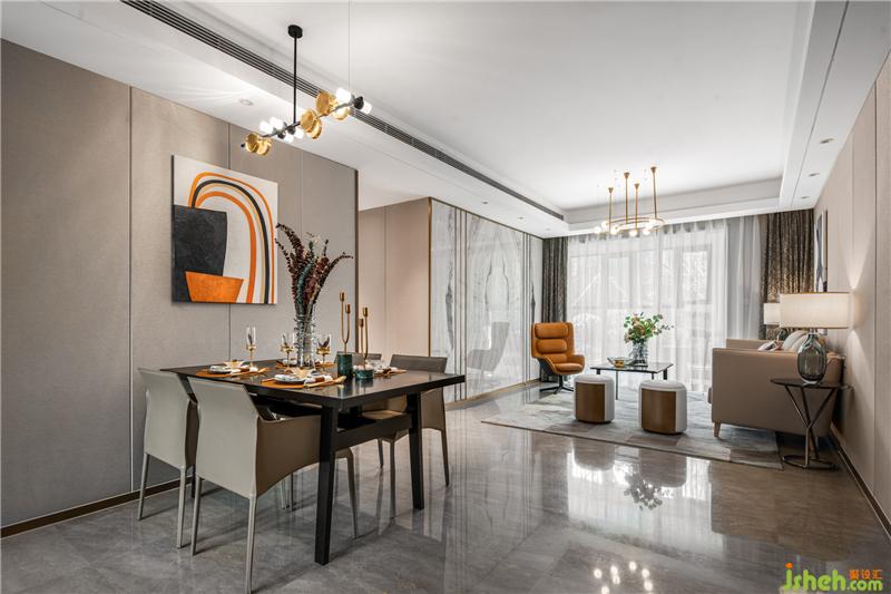 空间延续了建筑及室内细腻的氛围,优雅安逸的爱马仕橙贯穿整个空间,点缀蓝色对比。香槟金属吊灯来自金器本身的光泽,提亮整个空间质感,形成现代轻奢精致与细腻并存的空间氛围。