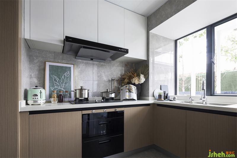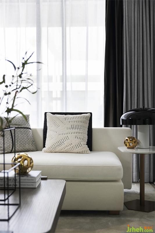客厅通过开放的空间设计与舒适的材料,营造轻松、精致又不失格调的氛围。黑白灰为基础色,点缀了几处“垂杨几处绿烟浓”的“绿烟”色(绿烟是指初春的杨柳泛出的如烟一般的绿色),既保留了绿色的生机又给人以平静的感觉,使空间独具韵味。