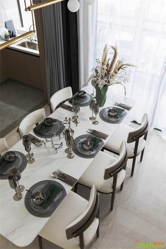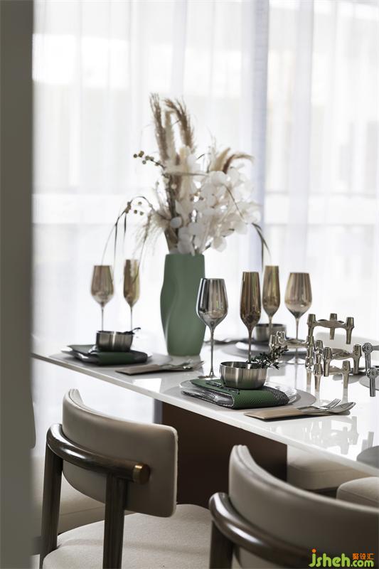 "唯有美食与爱不可辜负";餐厅延续了客厅的诗情绿意,精致的餐具错落有致,四方餐桌与餐椅方正排列有序,有层次感的椅背搭配白色大理石台面的餐桌,花瓶与餐布的绿,不多不少,整个用餐空间营造出自然健康舒适的氛围。