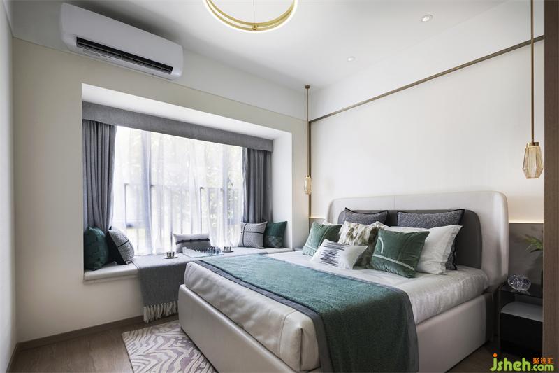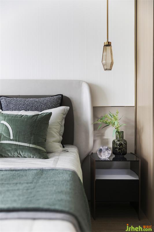 卧室是理性营造的积极生活所带来的幸福空间。我们仍以一抹绿意为主调,以柔软的布艺柔化空间的感觉,提升空间的舒适度。木地板细腻柔和的光泽感,仿佛是添加了一层柔光滤镜,床头垂挂两只极具艺术感的灯具,更加突显卧室的风情,温暖而舒服的大床,自然在其中悄然演绎,与平静有序的时光一同温存出优雅的韵味。