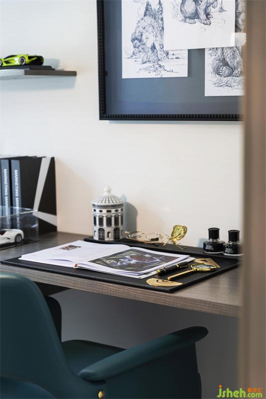 书房是展现户主深层底蕴的场所,同时也是运筹帷幄的思考空间。样板房设计上我们追求空间的主体性与实用性,墙面的挂画粘贴的是男主人随笔的工笔画,只为记录转瞬即逝的灵感,简洁干练造型的书桌,能让男主人在此尽情创作。