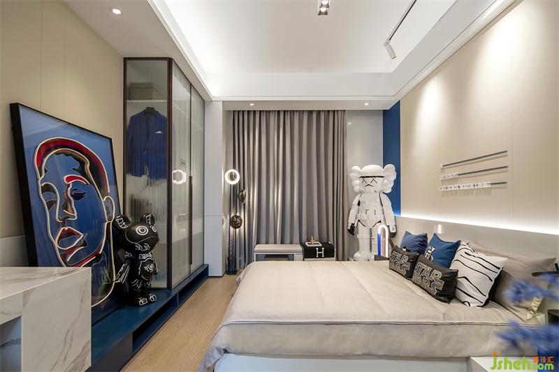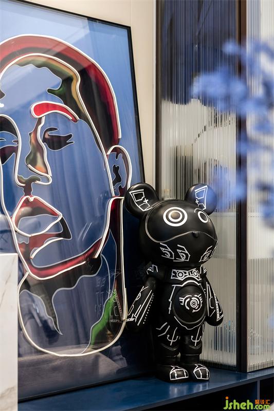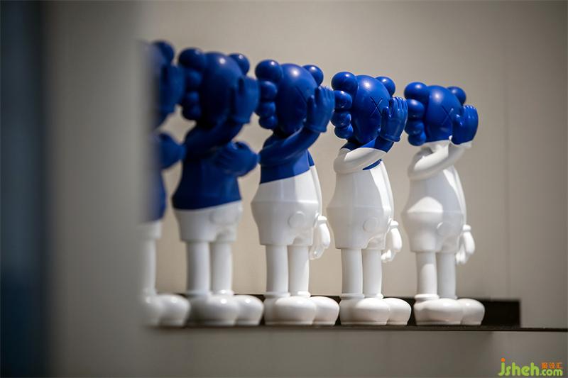 空间整体以灰白皮革硬包加墙布打底,在干净利索的底色上铺陈克莱因蓝,通过不同大小不同体态的KAWS玩偶的陈设,让整个空间充满了动感。