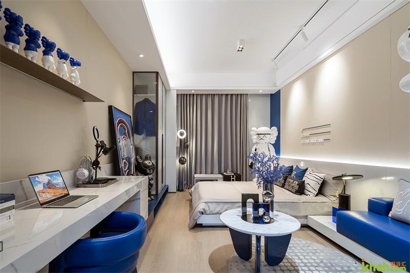 居住户型公寓样板间主人公我们设定为一位27岁的潮鞋玩家,整个空间根据他每天的日常起居和生活动线来展开设计(早上7:30-8:00起床,在厨房泡一杯浓郁的咖啡,开始新的一天;9:00-9:30在窗户前伸个懒腰,浏览各种潮流资讯,为新的收藏做好笔记;9:30-10:00线下好物分享,在各种网络平台跟玩家和粉丝文字互动;10:30-11:30潮玩话题直播,背靠沙发,打开视频在线跟全国的玩家交流收藏心得,分享即时好物;下午3:30-4:30室内健身运动,在保证精力的同时也保持健美的体态)。