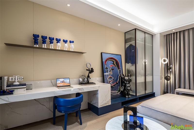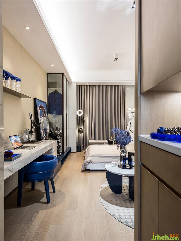 结合主人公的职业及爱好,我们将空间引入了极度纯净的克莱因蓝。克莱因蓝是一种独特的天青石蓝色,兼具群青色的深沉内涵,和蓝宝色的高贵光泽,能唤起人们最强烈的心灵感受。整个空间兼具时尚潮流和生活温度的同时,又非常注重居室空间的布局与使用功能的完美结合。