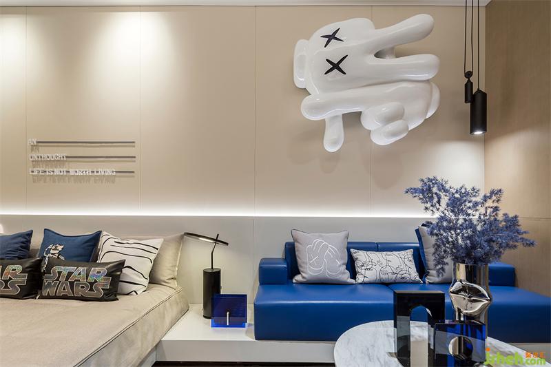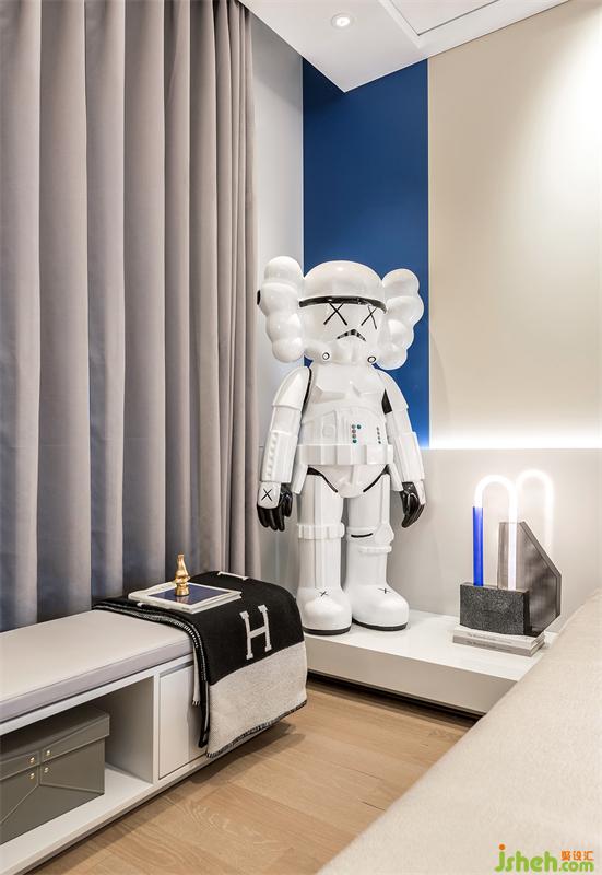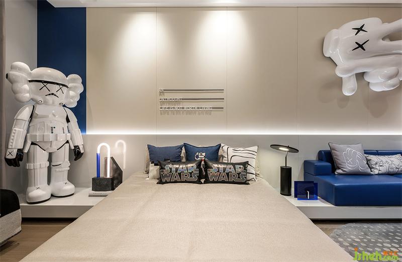 样板房设计中,充满戏谑和美式街头音乐的霓虹装置画,可爱又暗黑的玩偶摆件,克莱因蓝的亚克力收纳盒都展示了空间主人的品位和喜好,凸显着当代年轻人对艺术的无限想象与个性的极致追求。