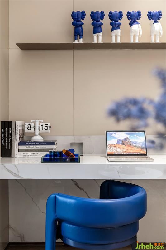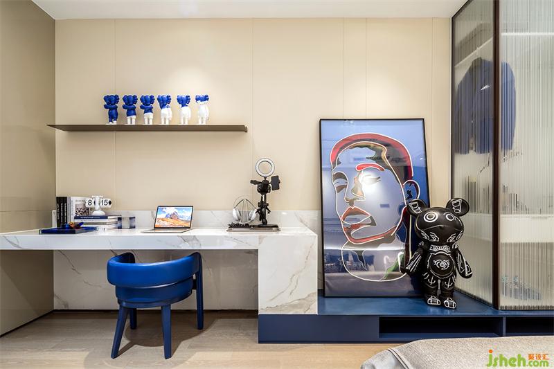 书桌空间我们将其定义为这位潮玩博主的直播间,符合当下新时代的发展方向,一排蓝白相间渐变KAWS小玩偶,增强了空间的趣味性。KAWS作为有趣灵魂的桥梁,贯穿着整个空间,将艺术审美转化为可共鸣的精神语言。