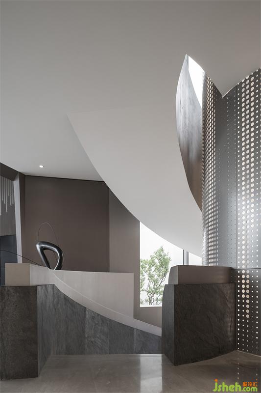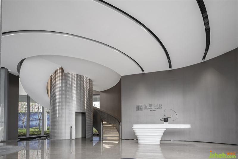 自一层弧形旋转楼梯进入到二层接待厅,近旁影音室180度弧形投影幕将华耀城尽收眼底,通过视觉+听觉的双重体验感给客户带来心灵的慰籍和对美好生活的向往 。