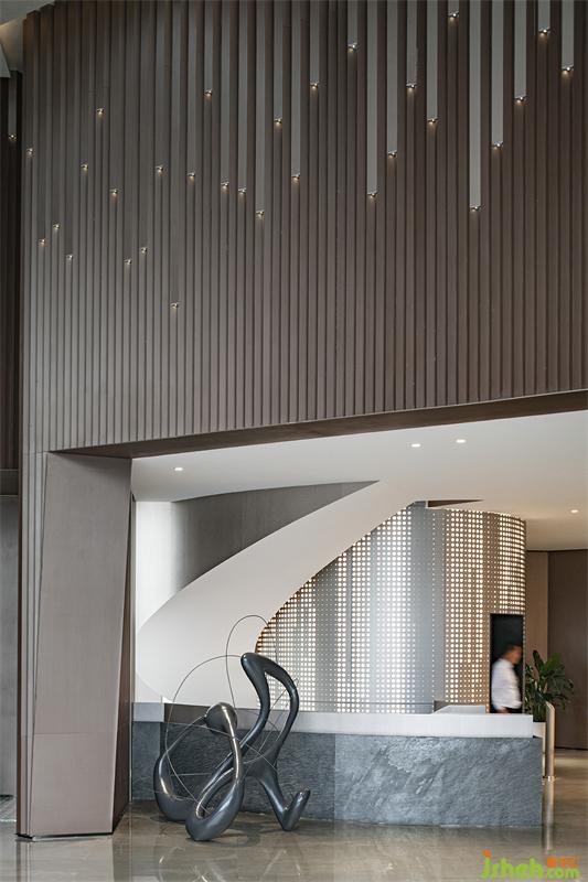 夜空,重迭出幻象间的交替片段,如同进入宇宙场域。行径间,不再是踏上实质地土的触感,当慢慢感受轻盈漂浮,将步入另一种以太空载浮为家的生命空间的维度。门厅接待区艺术装置由金属成型制作,表面采用特殊工艺处理,附着砂砾,“星球”上砂砾与肌理的质感,在灯光下闪烁着神秘浪漫的气息,仿佛置身在静廖玄妙的宇宙星河中,大气磅礴。