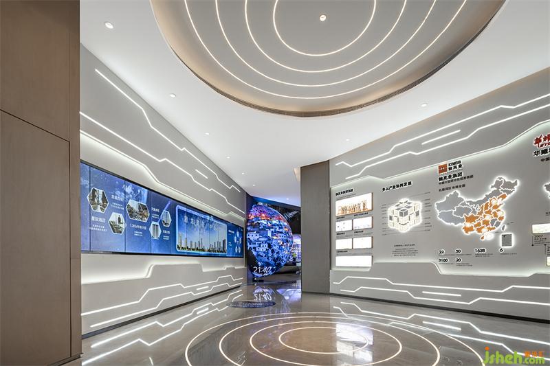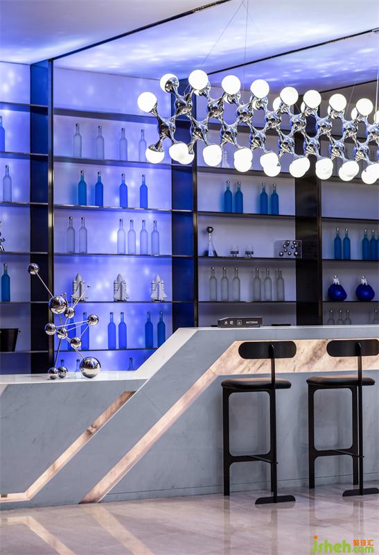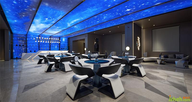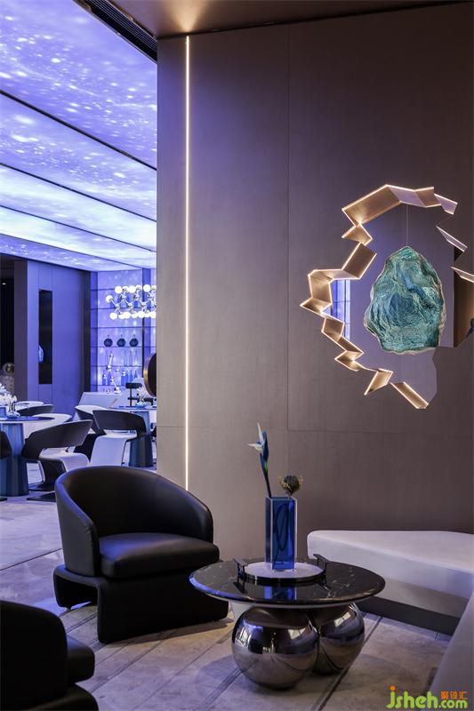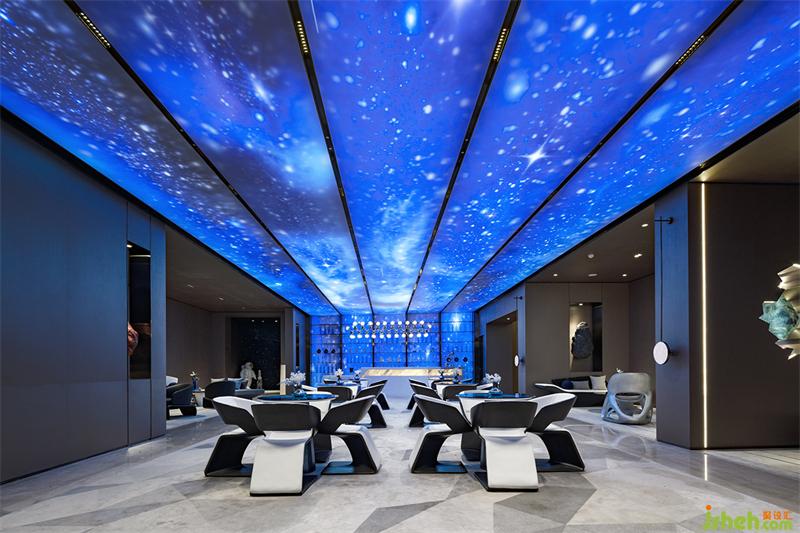 高级灰与科技蓝的晕染,明艳的色调使其成为空间的视线牵引点,而清冷灰的反衬则流露着未来科技感的神秘意味。吊顶造型通过浩瀚无垠的宇宙作为背景,从墙面贯穿到天花,让整个空间充满了向上的生长力量,雕塑艺术装置则通过“陨石”为设计理念进行呈现,精致闪烁的陨石,在万物生长之间注入了无限活力。