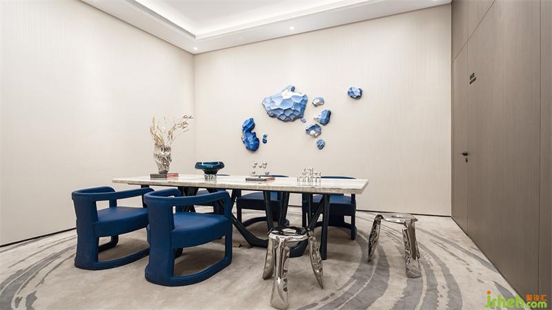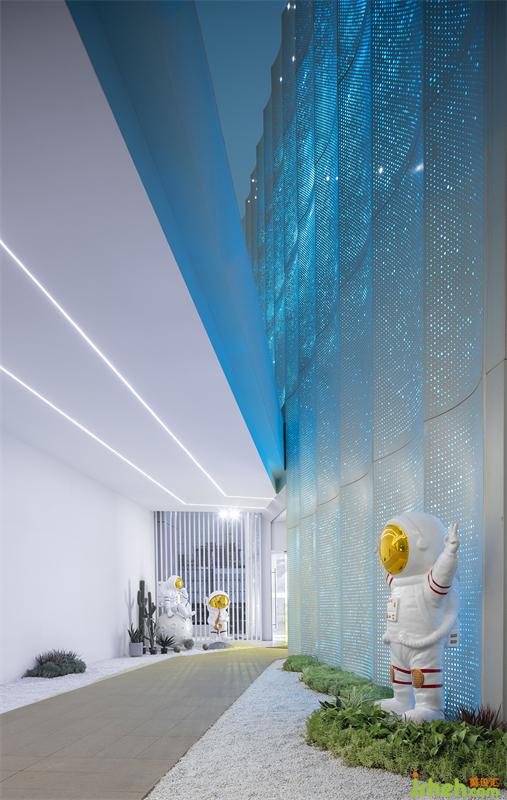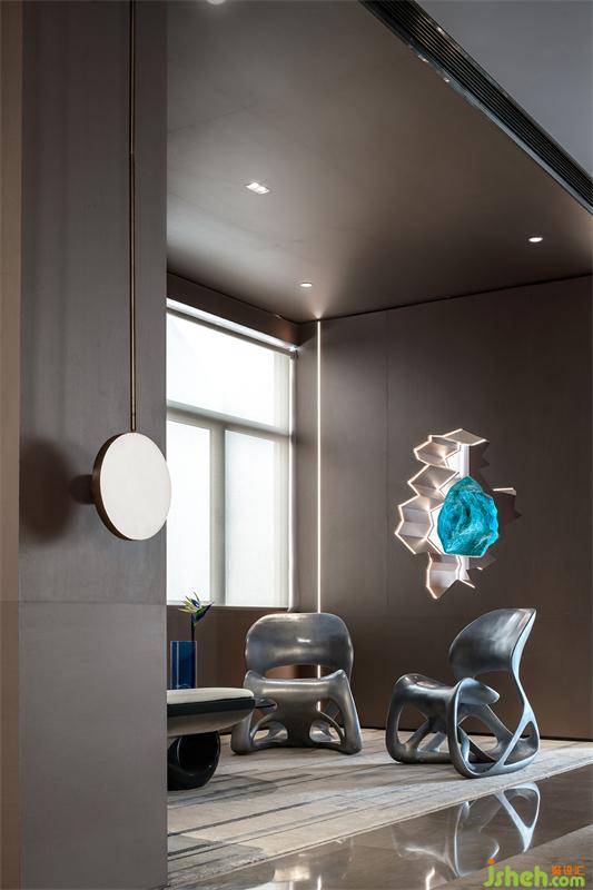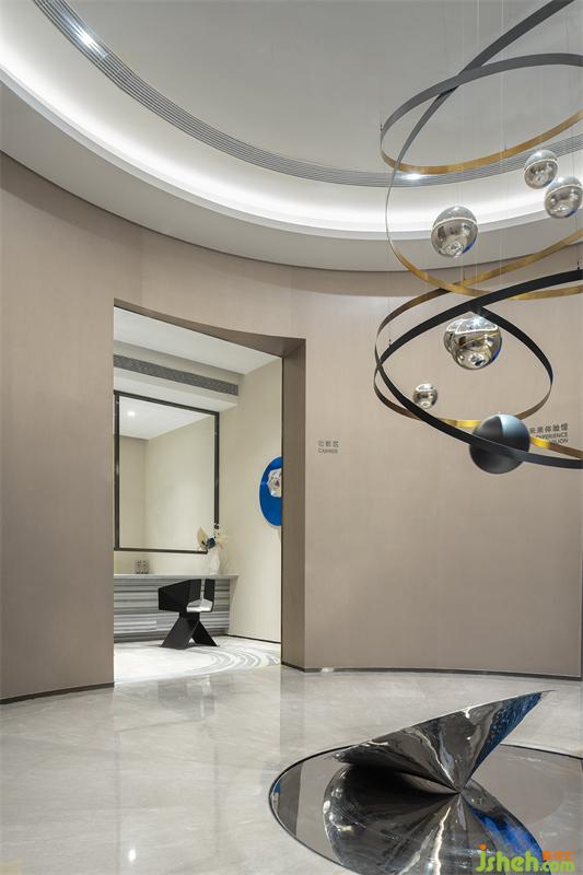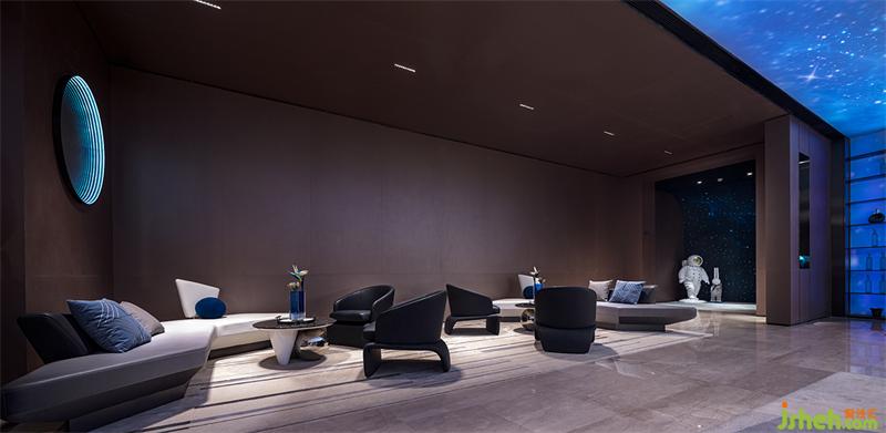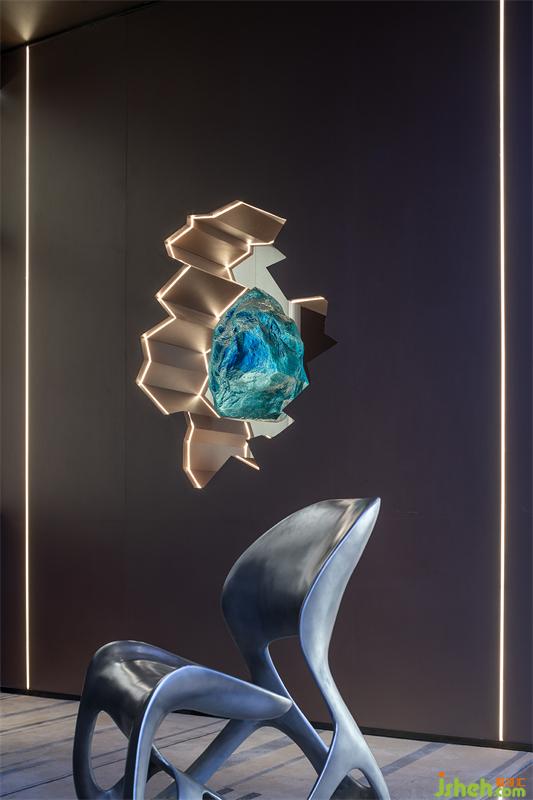 流星体,流星和陨石都是宇宙中的碎片,在包罗万象的宇宙中漫步前行,形成壮丽的神秘景观。签约室墙面的艺术造型,我们提取宇宙碎片的不规则性,以符合空间切面的形式,提炼出简洁的菱形装置,律动般悬挂于墙面,使行者仿佛漫步于浩瀚宇宙下,增强空间的趣味性。