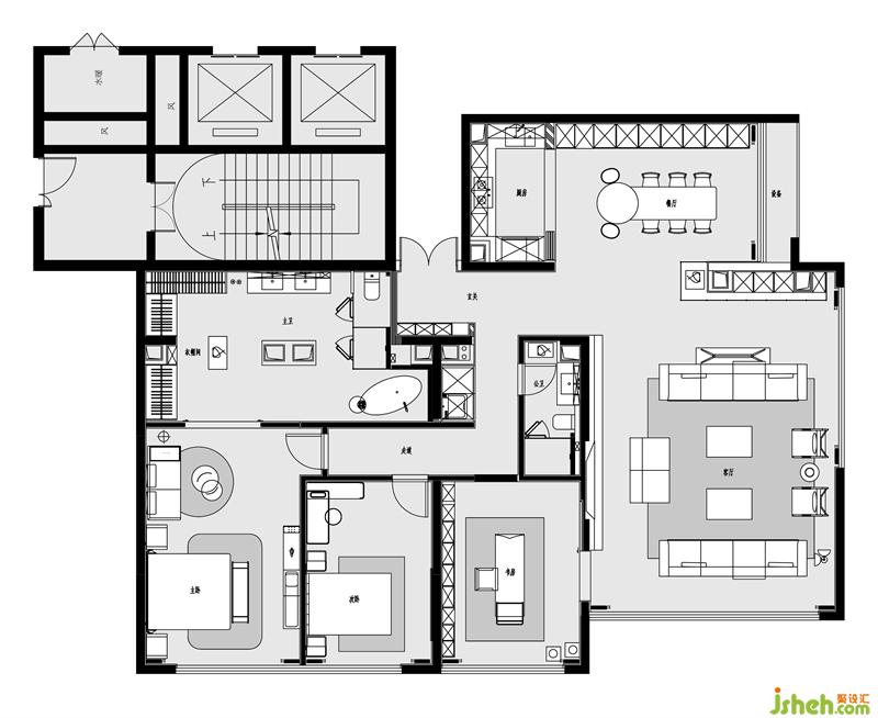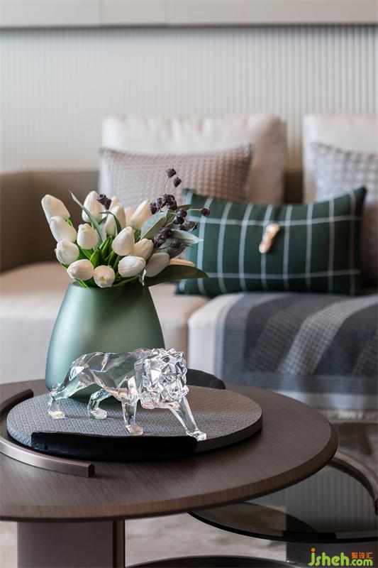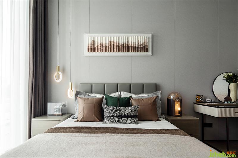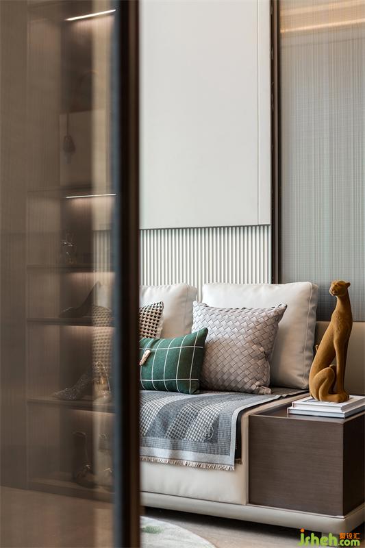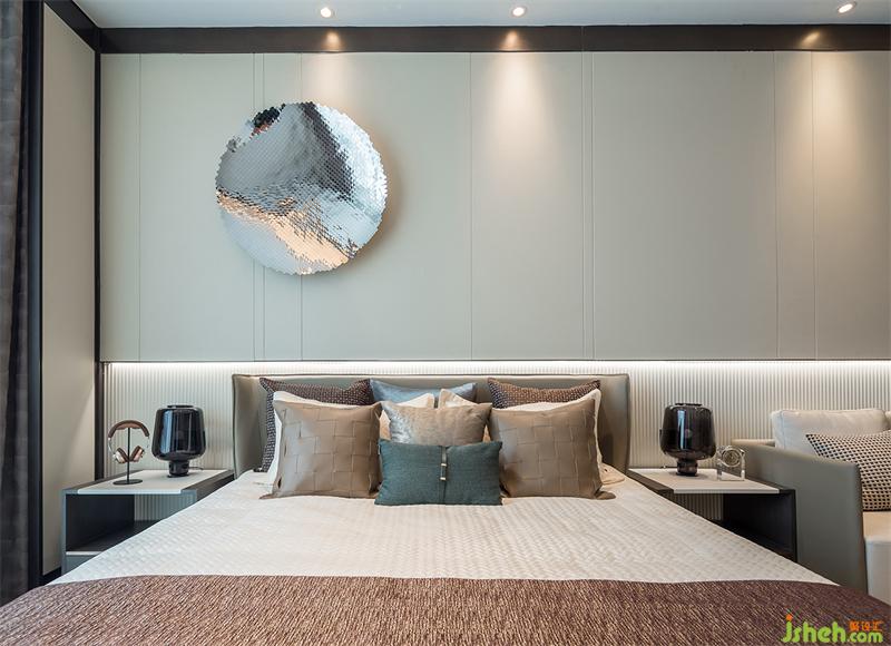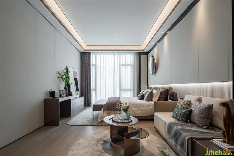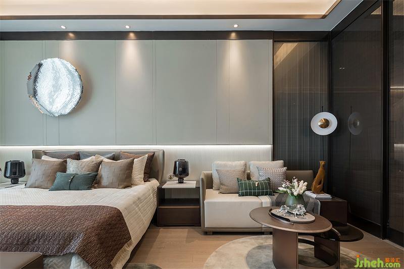 卧室的通道有两条:一条穿过客厅书房,另一条则是从门厅直接转角到达。主卧的空间足够宽敞,我们将其分为会客区、卧室区以及开敞式衣帽间和豪华卫生间的大套房。整体空间样板房设计从图案色彩到材质运用皆体现出雅致的意味。男主人睡前在沙发上浏览行业资讯,打个小盹,翻阅从瑞士带回来的钟表画册;女主人递上爱马仕羊绒毯,温馨又甜蜜。靠着大靠包,两个人在睡前交流各自的生活心得,偶尔俏皮的打闹;抑或早晨的阳光透过绵密的纱帘一点点洒进来,她欣赏着他熟睡的样子,亲吻他迷人的轮廓......
