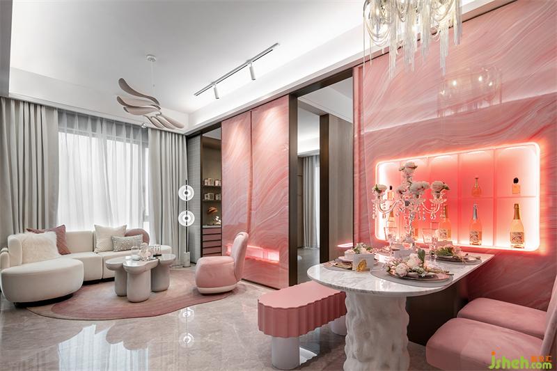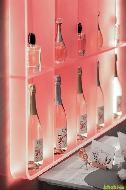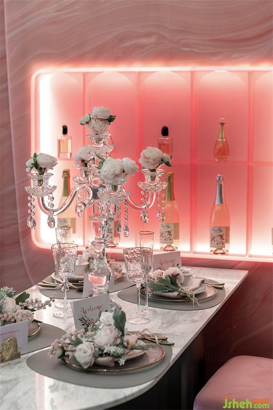 我们将餐厅空间打造成“VIP甜品尊享会”的场景,样板房设计用花束装饰的水晶烛台如同花神优雅伫立,在粉色的花束包围中暗藏着新品伴手礼,粉金丝带包扎的餐具,金边骨瓷餐盘,撰写VIP名单的邀请卡,阵列的香槟气泡酒和香水,尊贵奢华,浪漫温馨。