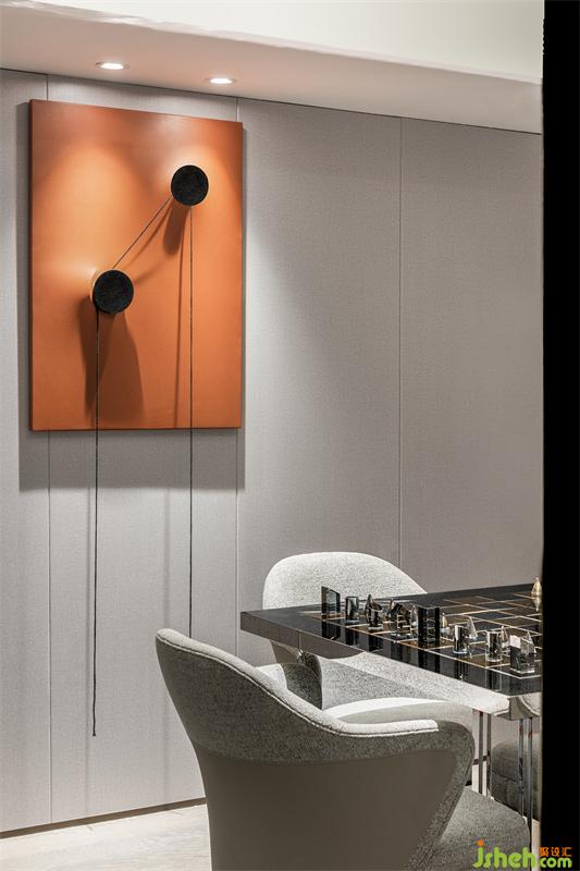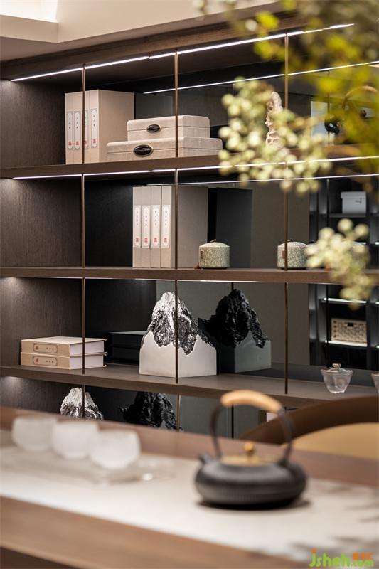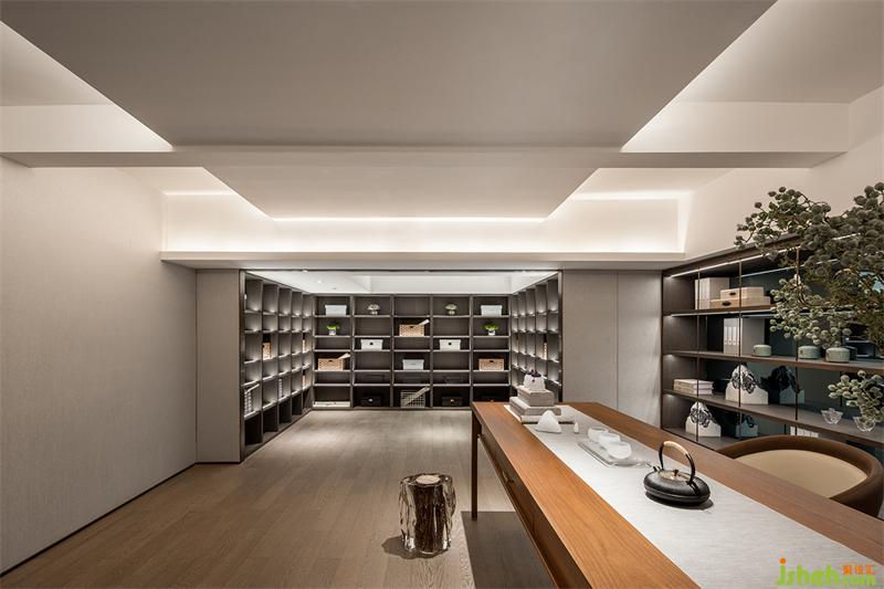 陈羽曾在《茶经》里说到喝茶的客数,最适宜数三数五,他讲“茶性俭,不宜广,广则其味淡澹”。茶室的浅色调,配浅木色木地板及木格栅,软装则以重色家具和较低的茶台调和空间沉稳的调性。