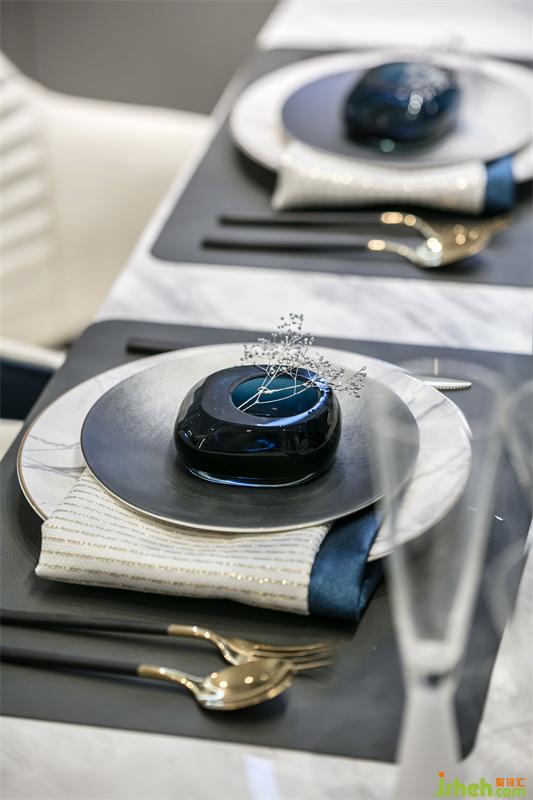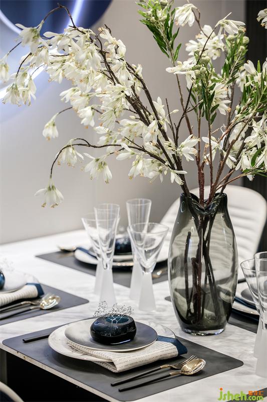 东方文化的骨髓里都在强调对称和仪式感,整齐划一的餐具,对称排列的餐椅,星星阵列的吊灯,在碧城色圆月型壁灯的照耀下,有种圆满又回归的悸动。女主人精心准备的姜花显得格外的典雅和悠扬,画面再现“漫空沙气蜀姜黄,一角高城漏日光”的场景。