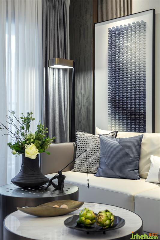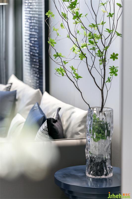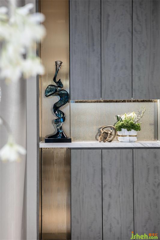 在方正的客厅空间,我们用借景的手法打破对称,铜川样板房设计在胡桃木饰面打底的背景墙上悬挂着一幅时光的印记——用水晶马赛克演绎的檐角片诉说这座城市的过去,又播放着家的未来。边几上屹立的吊钟将家人的优雅姿态诠释的栩栩如生。回到家洗去外面世界的嘈杂,与家人闲坐,轻松自如,没有了拘谨和束缚,释放身心。我把玩新买的小雕塑,你凝望上次生日收的释迦果。微风袭来,茶几上的山茶花撒播着沁人心脾的香味,是甜蜜生活最真切的注脚。