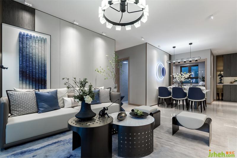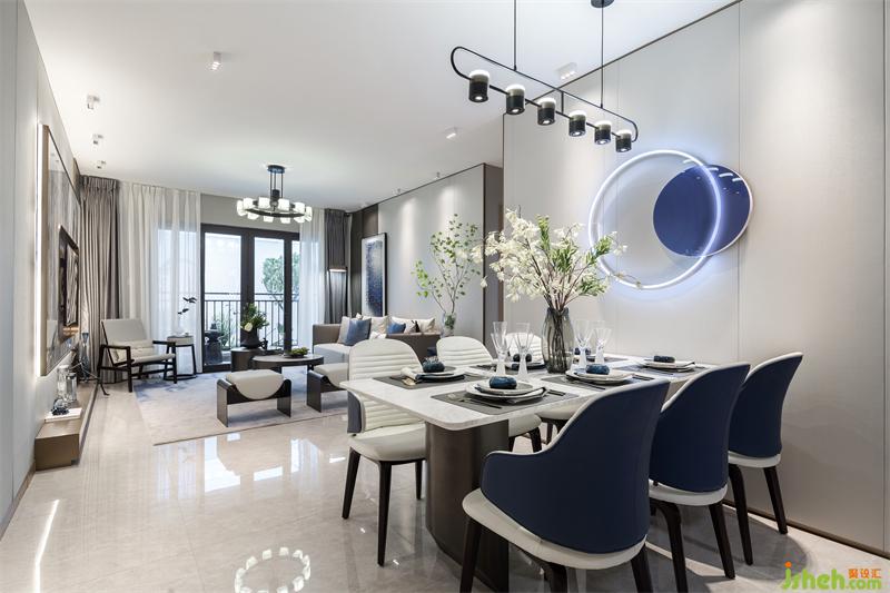 本次项目位于铜川市新区南部,交通便捷,周边景观资源丰富。我们在延续本土化解构形式之上,将海纳百顺的陕西文脉以当代艺术形式呈现,冀望给体验者关于精致生活的文化认同和人生启迪。我们从诗人李商隐的诗中提取到整个空间的主题色:碧城,其色星海幽蓝,其意天上人间。