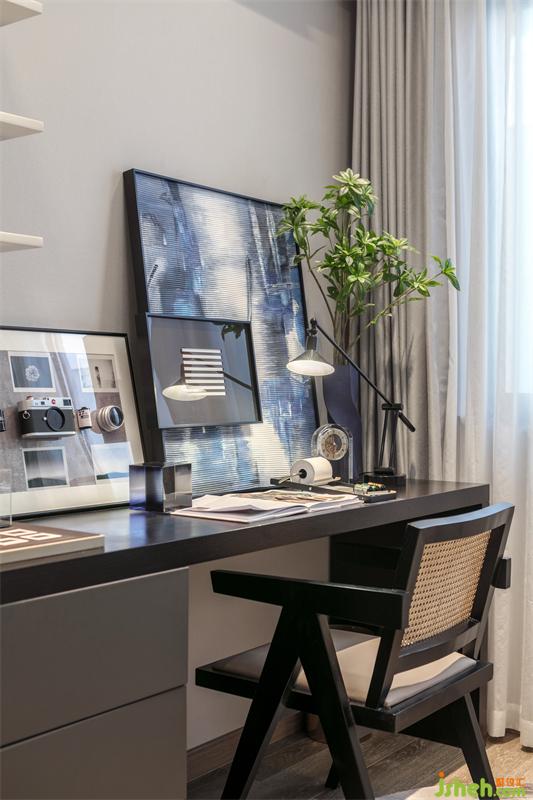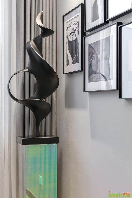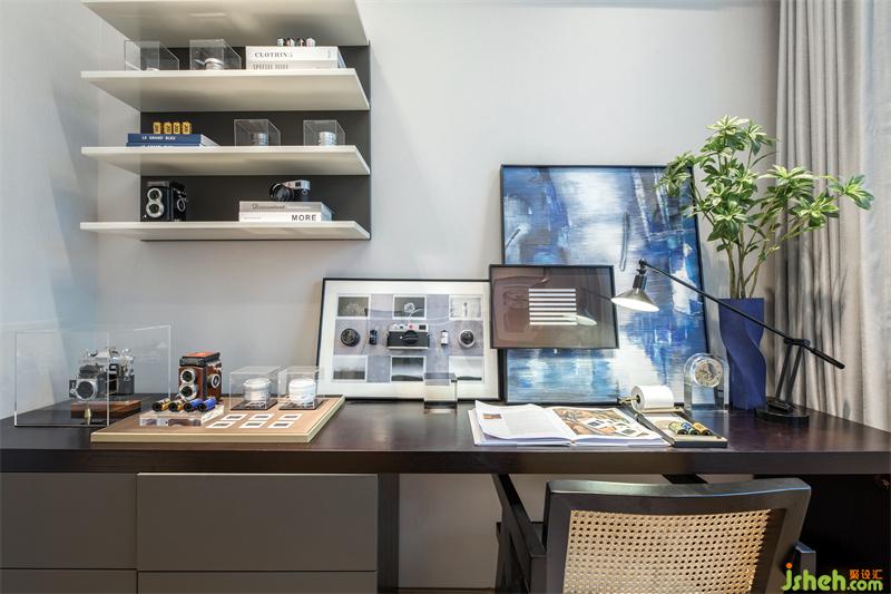摄影主题的书房打破常规的摆放方式,以工作室的形式展现,既丰富了空间的动线,又释放了空间的尺度。夸张又顽皮的达利摄影作品和雕塑摆件,铜川样板房设计仿佛在阐述东西方的艺术交流形式,东方的摩登与西方的开放,有种豁然开朗的戏剧张力。