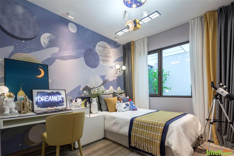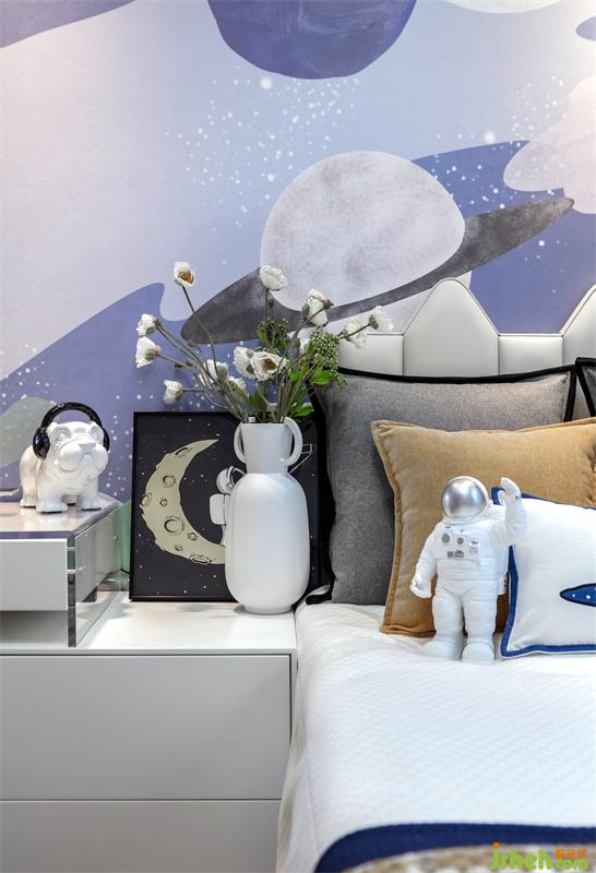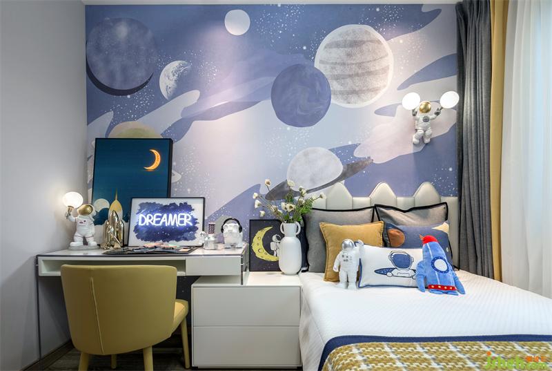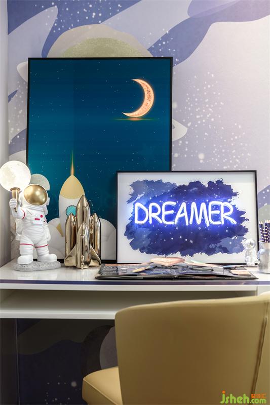 每个小男孩都有一个开飞船的梦想,带上自己的画笔,乘着歌声的翅膀,穿越太空去看看月球上是否有迷路的宇航员……黄蓝色系的男孩房充满太空的气息,飞船模型吊灯,闪闪发亮的霓虹梦想画,若隐若现的月亮灯,宇宙星球立体书,在自拍的宇航员等,整个空间的软装都充满了动感,让孩子们瞬间穿越,随时飞向遥远的太空,去实现“长大我要开飞船”的梦想。