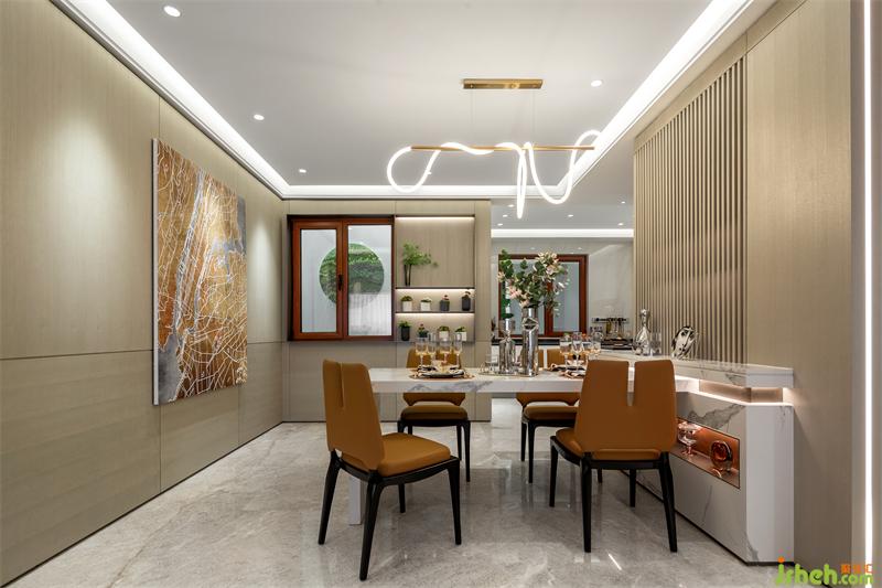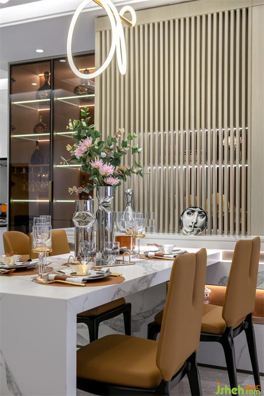 餐厅我们选用橙色系的餐椅和白色大理石餐桌加以搭配,在整个浅色调的空间下,就餐区的功能和感受尤为深刻。样板间设计极具现代简约风格的吊灯,将线条感表现到了极致。餐厅酒柜区收藏着男主人到世界各地旅游收集的美酒与酒文化相关的书籍,充分体现了男主人的高尚生活品质。