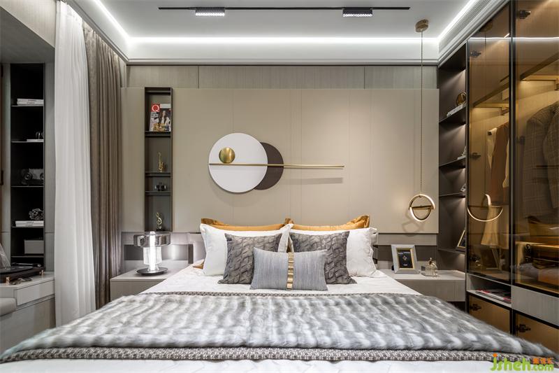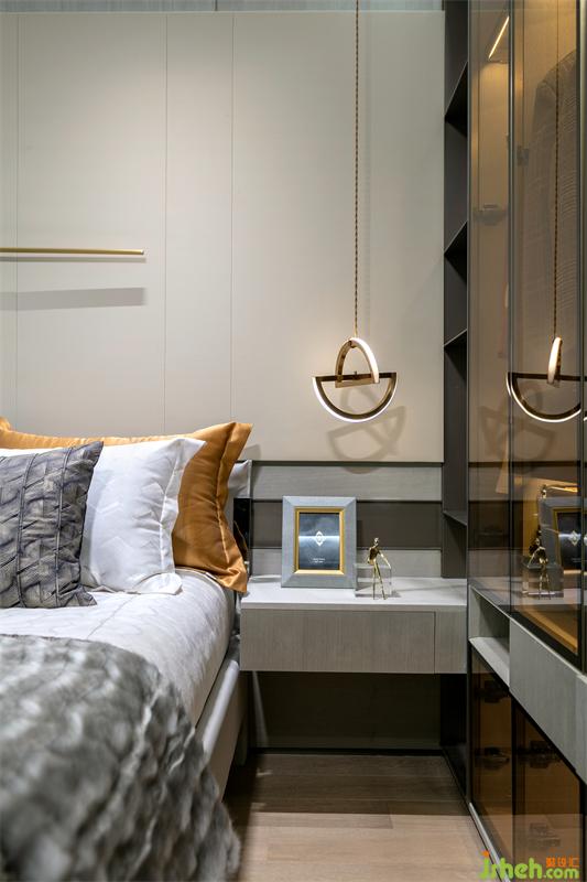 浅色框架的皮革床,搭配极具现代风格的床头柜,样板间设计配有作为金属点缀的台灯和吊灯,为整个主卧空间增添品质感和舒适感。样板间设计床头一幅现代线条感的装饰画,在浅色竖条纹地毯的映衬下,现代风格的代入感极强。飘窗同时也是男女主人的休闲生活区,音乐唱片,咖啡休闲,周末下午一首歌一杯咖啡,卧室成为男女主人放松休闲的最佳场所,时光在这里显得格外美好。
