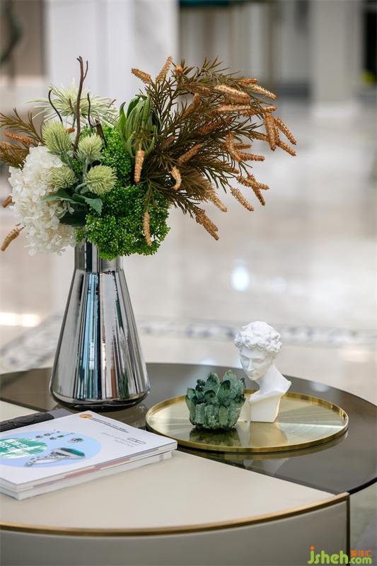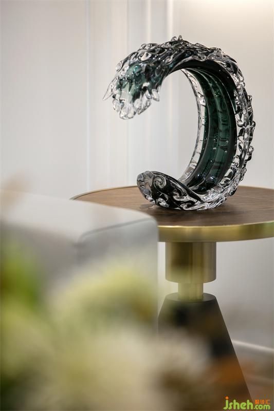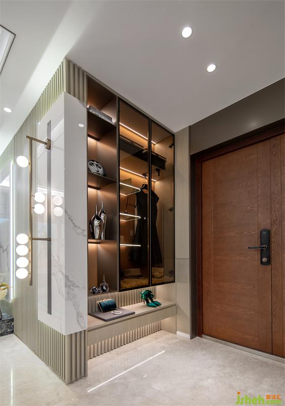 样板间设计运用黑白灰为主色调,金色、绿色作为点缀色。玄关是进入整个空间中的第一印象,也是主人职业特性的体现,精致的服装及珠宝,是受益于女主人的职业特征,精心为家而打造的,女主人是一个爱装饰家的人,同时也给空间氛围增加了仪式感和归宿感。