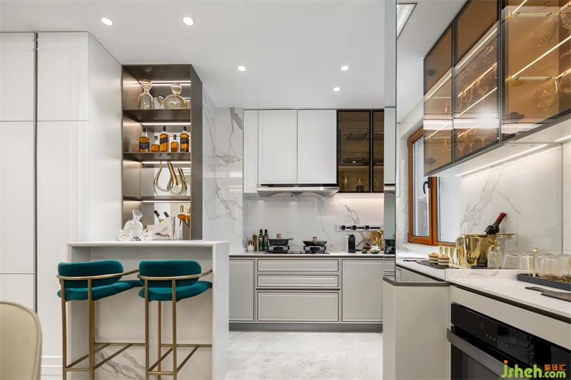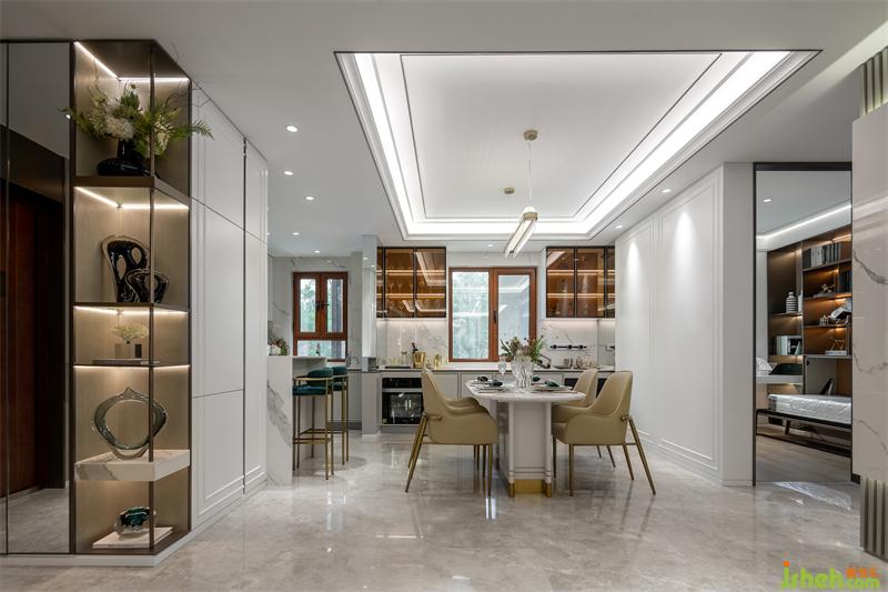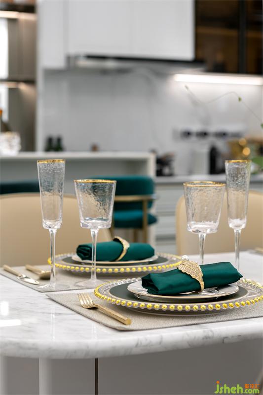 样板间设计客餐厅相连,餐厅的空间较为狭小,所以我们选用了较为简单且有品质感的餐桌与餐椅。每一个阳光明媚的下午,与家人享用着中西餐的美妙幸福时刻,新鲜美味的香气环绕着餐厅和厨房空间,这就是家的味道。