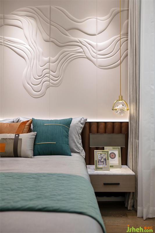 卧室是高雅的艺术场,承载着空间的情绪性表达。样板间设计高品质且具有设计感的床和床头柜,边柜墙面放置较为抽象艺术感的挂饰,以一扇窗打通室内外的联动。