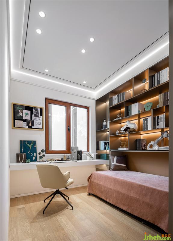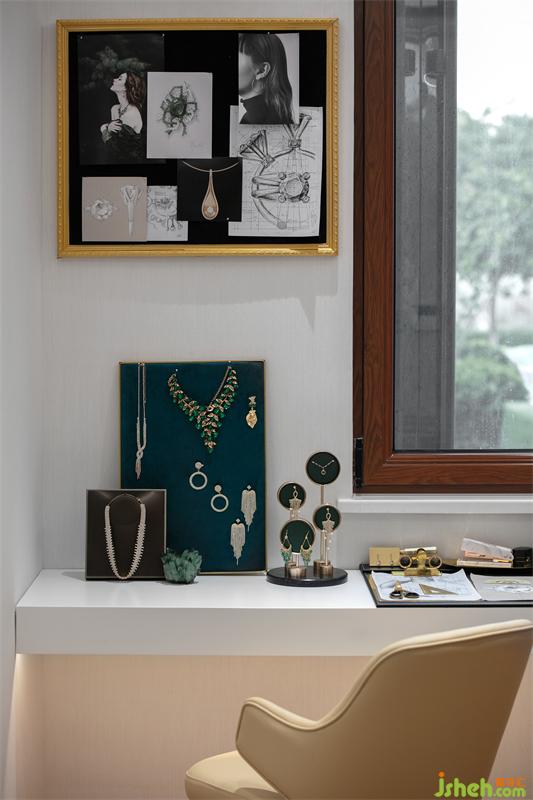 女主人是一名珠宝设计师,书房以人物的特性来进行软装塑造,设计珠宝的手稿、珠宝成品展示、珠宝书籍等都是体现女主人的职业特性,同时也体现了女主人对生活高品质的追求,以及潮流时尚的生活态度。