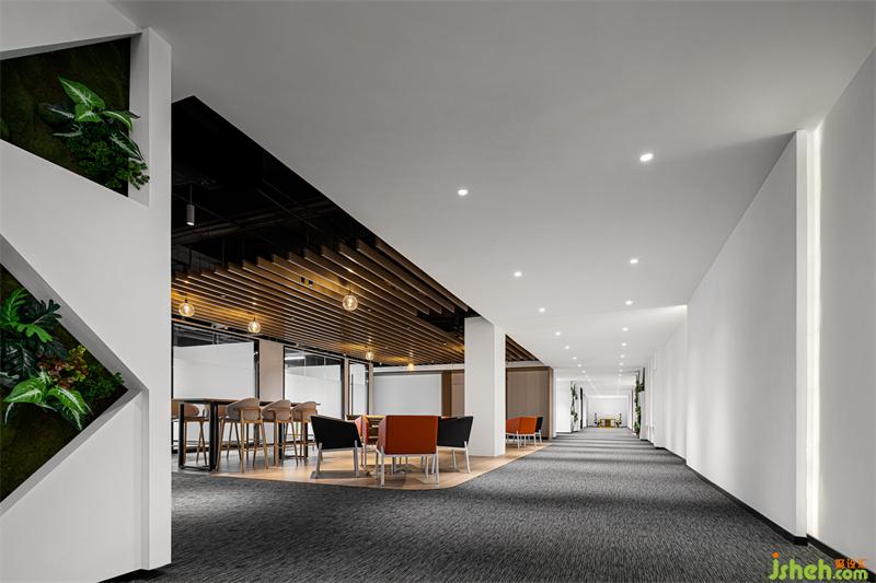 办公空间通过“中央休闲区”和通道绿植墙,构建出一个休闲和绿色区域,家具选品采用简约造型且高低层次丰富,功能上具有多种组合的产品,色彩上也采用了撞色组合,使空间的氛围更活跃,更自由。