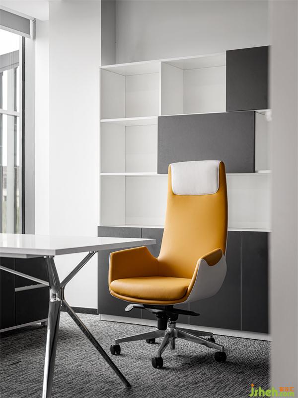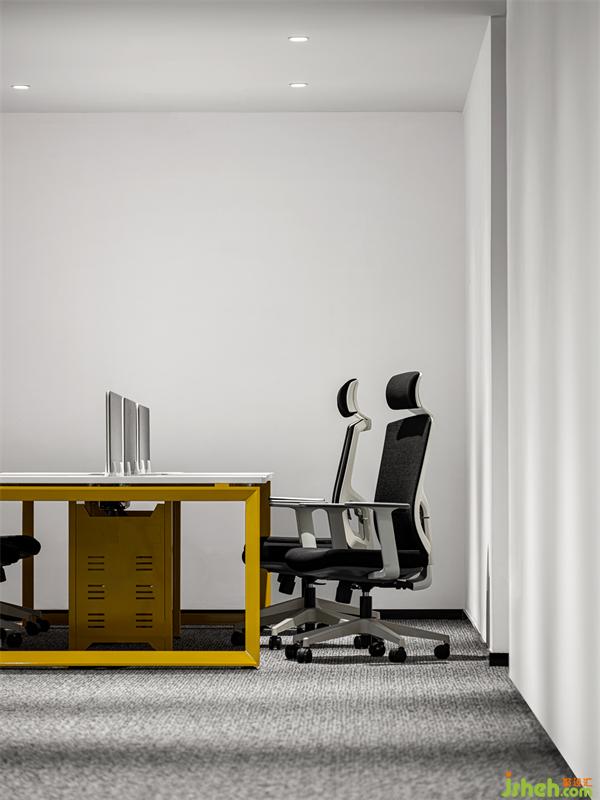 整体办公位的排布上沿用常规有序的排布形式,展示中心设计造型上则选择简洁直线条,色调则选择较为干净的搭配,我们选用黄色桌腿作为空间的点缀色,使空间更具现代感,保持空间的通透性。窗边摆放休闲办公的吧桌和吧椅,使空间即有层次的变化,又具有多功能性。
