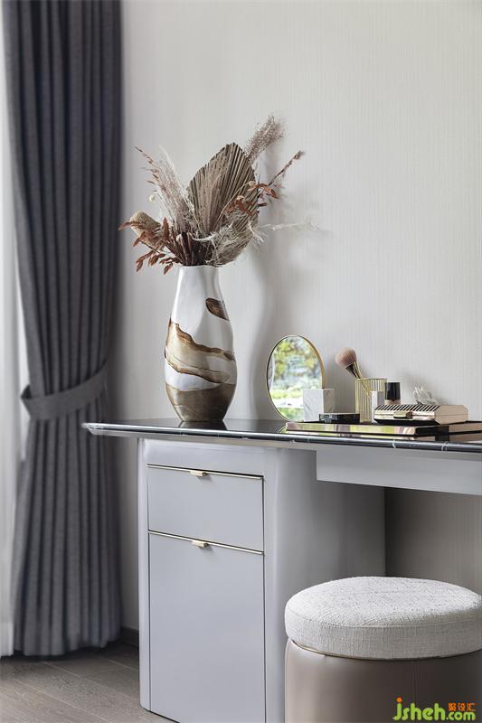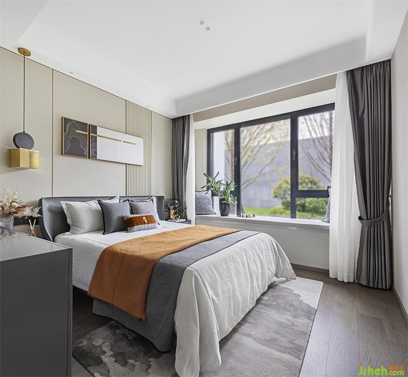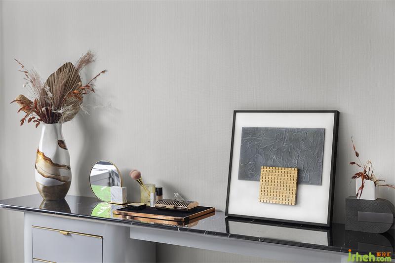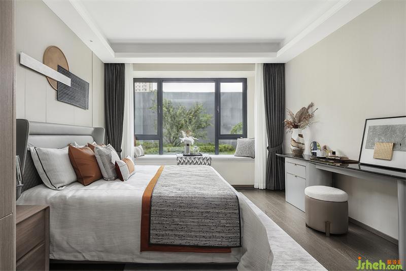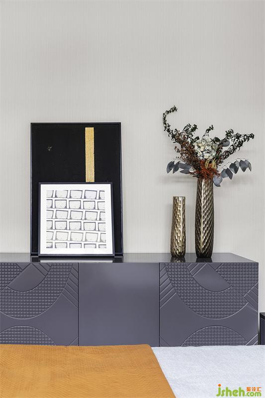 灰色是沉稳考究的态度,也是雅致柔和的意向,床品活力橙的出现让空间更加感觉舒适与温暖。西安样板间设计在“无往不复的天地之际”空间意识里,让身处卧室中的人获得精神与心理上的放松,享受当下独与天地往来的适意旷达。