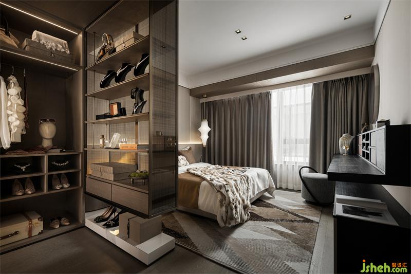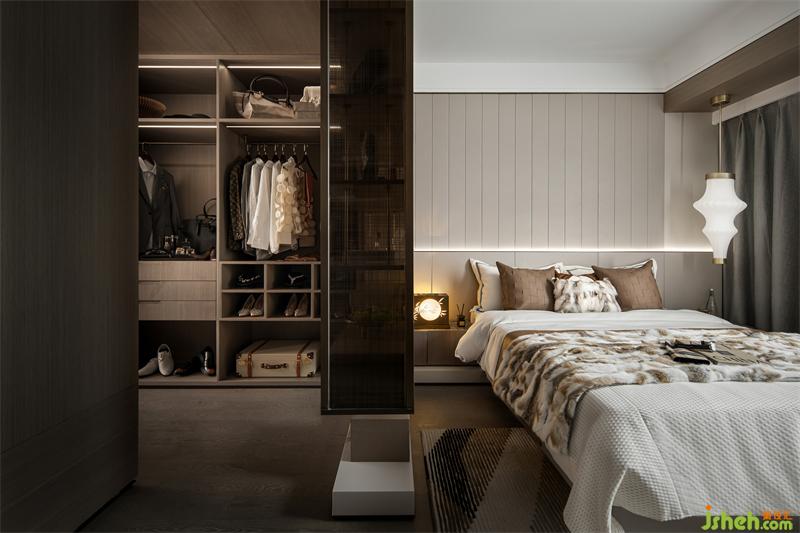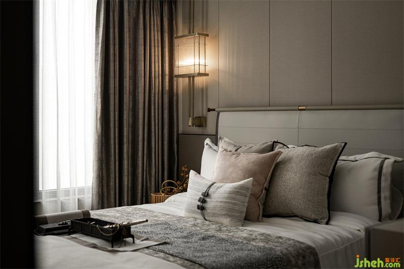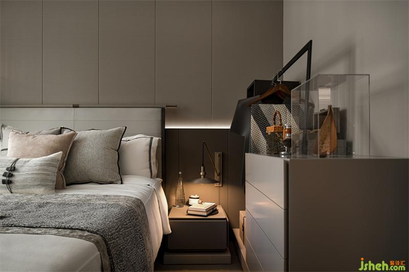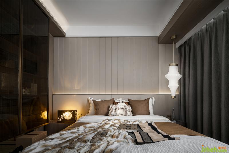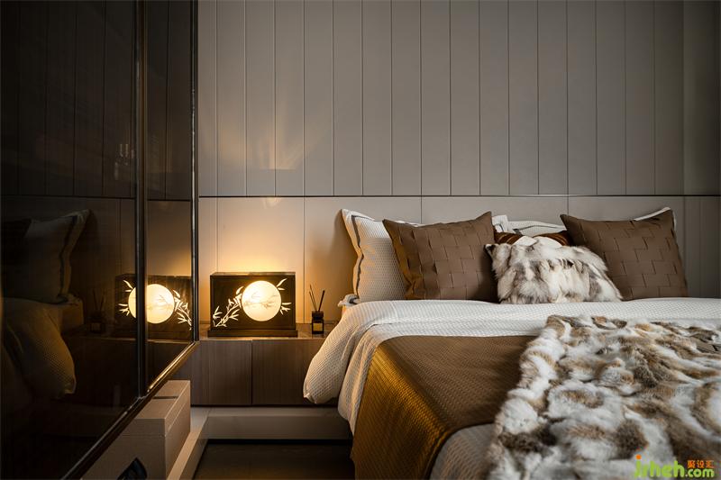 样板间设计考慮到空間的整體及硬軟一體性,在選材上我們高度結合硬裝,攝入酒店處理手法,將次臥的品質感最大程度的提升並融入生活氣息。