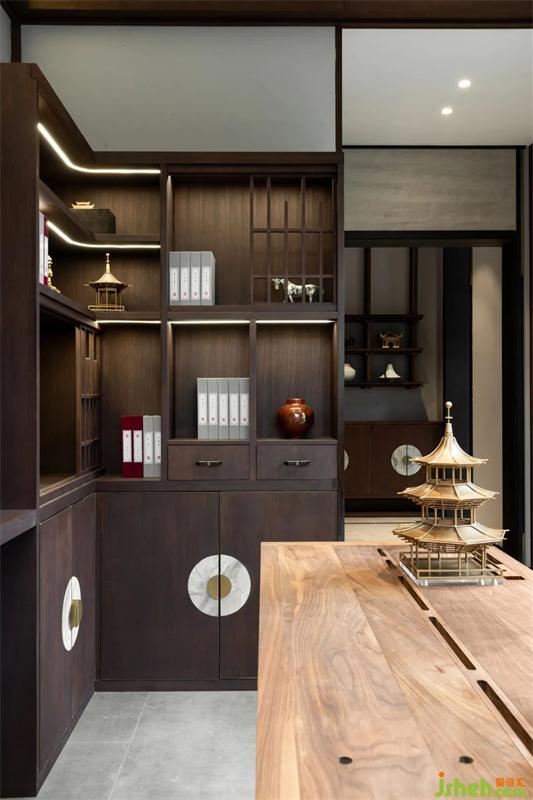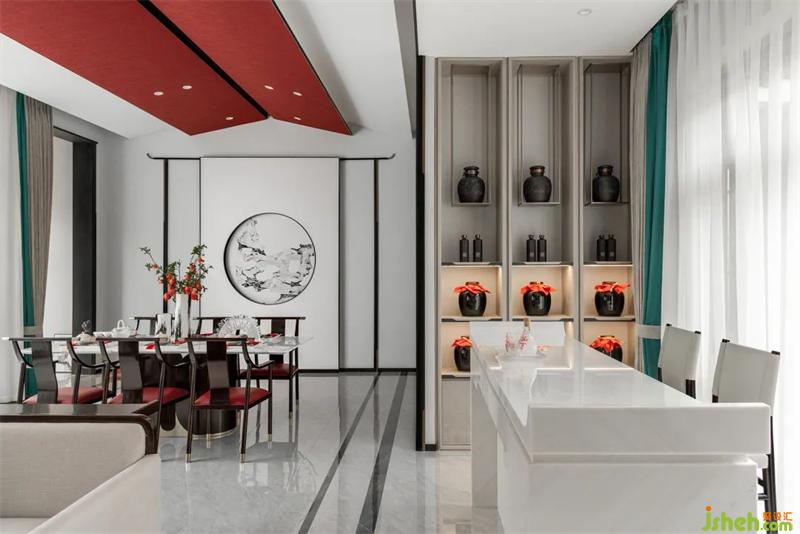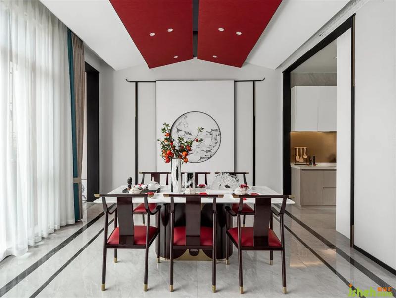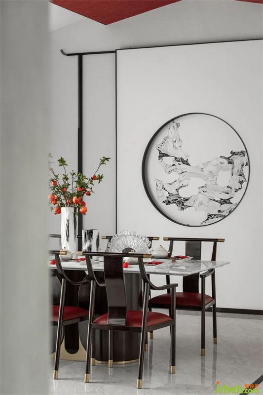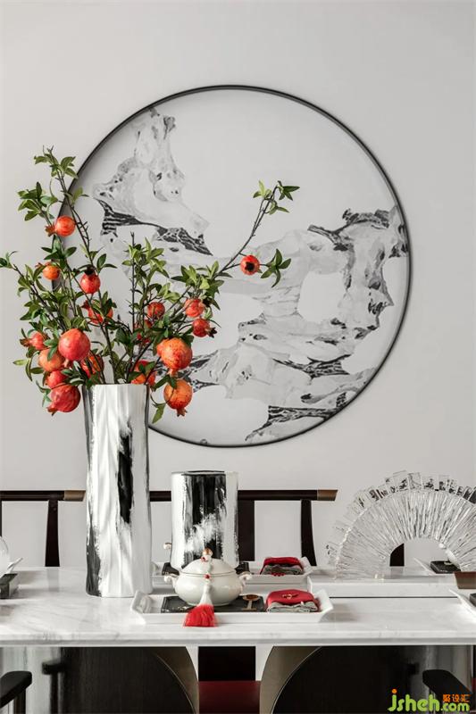 茶几上的花瓶与摆饰品,花瓶里红色花艺的点缀,让整个空间都显得格外的端庄。以梦为马,不负韶华,透过历史的年轮,我们看到过往历久而弥 新,与其相辉映。