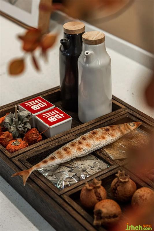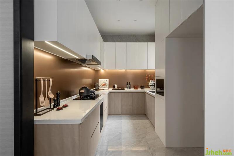 样板间设计以美学和艺术品位来诠释厨房概念,厚重的材质,凸显质感,空气中弥漫着高级的烟火气息。黑白色调的搭配,中和了橘与红之间的距离感,让整个空间更为协调。