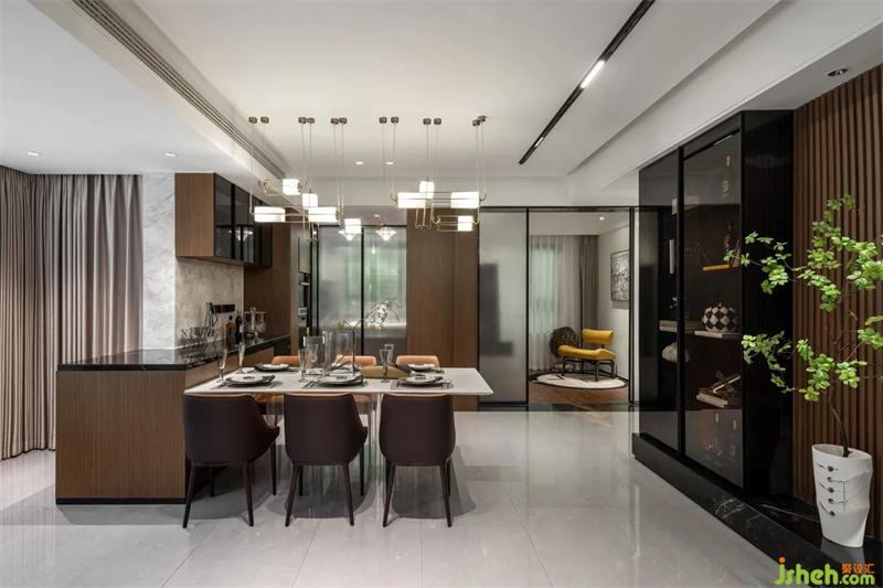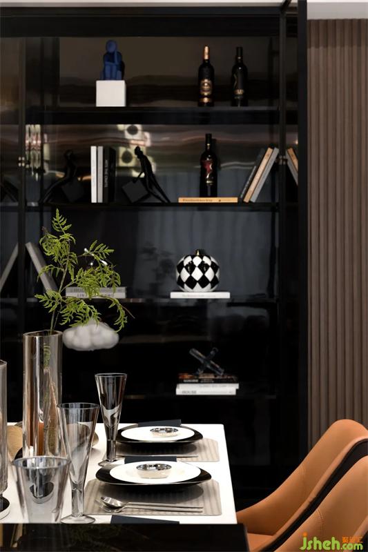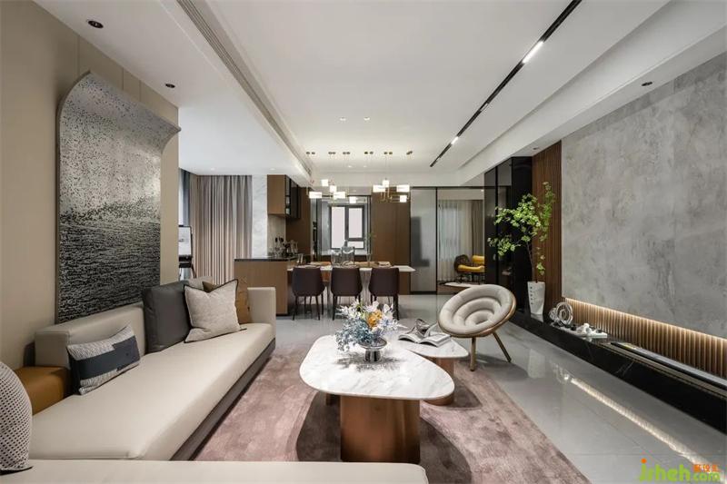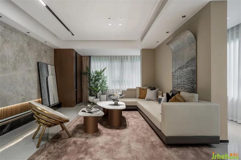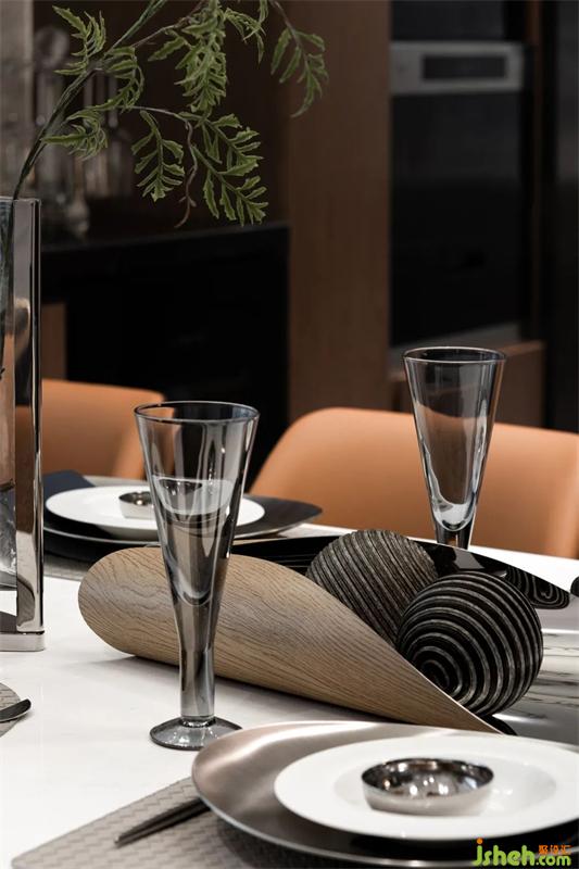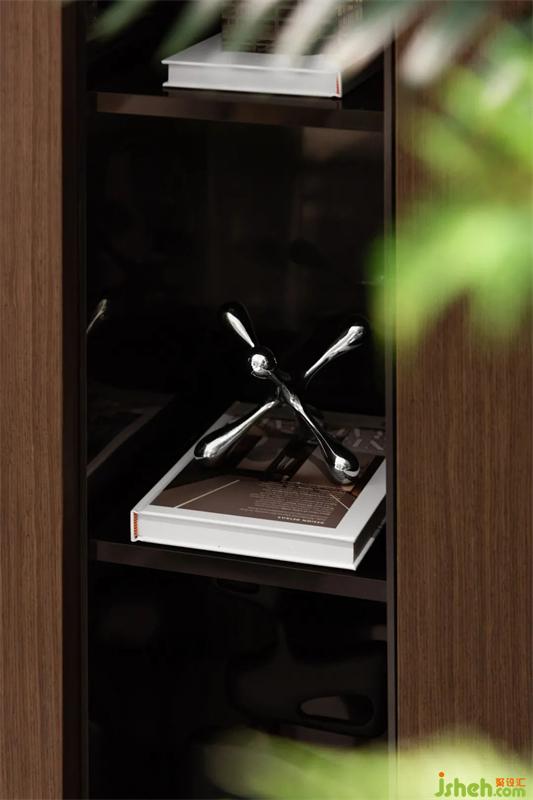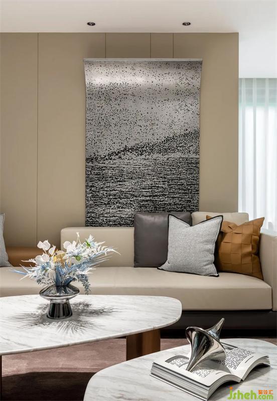 客厅是亲友间情感交流的趣味互动区域,同一空间中的不同状态,情感在传递。一缕阳光闯入到室内,让主人们沉浸在阳光的洗礼中。客厅背景墙装置为不锈钢材质,金属雕刻、人工锻造、高温着色。样板房设计在抽象与表现、隐藏与揭示之间取得平衡。它们捕捉运动与静止之间的诗意时刻,同时给人以重量和轻盈的印象。