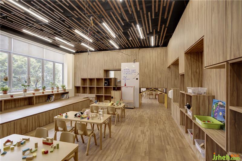 首先,设计师使用了简单干净的木色来作为整个设计的主要颜色,并用木质材料取代瓷砖和涂料。孩子们可以赤脚奔跑在木质的地板上,在无形之中向孩子们传达低碳,绿色环保的教育理念。室内设计师