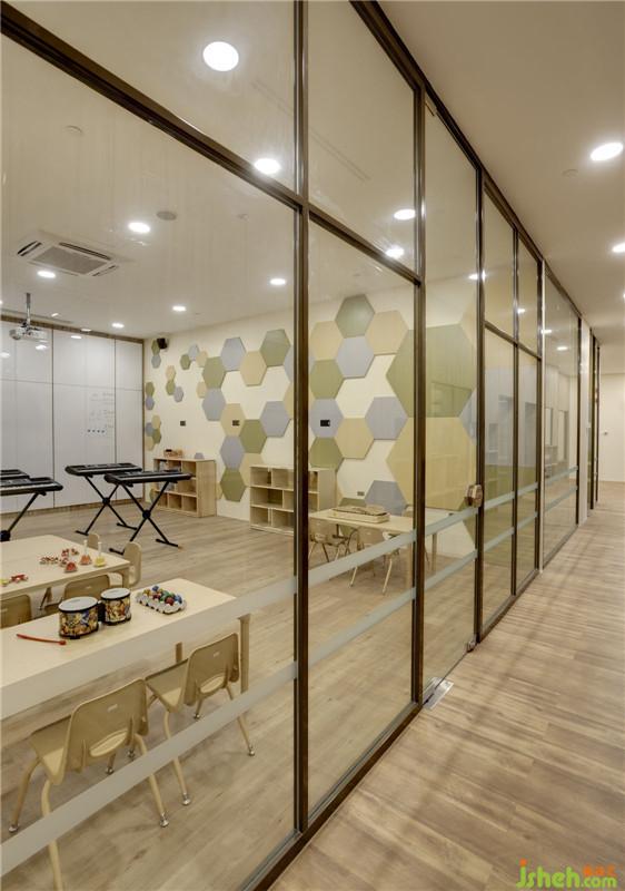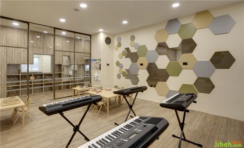 在音乐教室的墙面设计了三种不同由六边形由三种颜色的六边形组成,有青春朝气的绿色,积极向上的黄色和象征平缓安静的灰色。运用这三种色彩的淡色系,给孩子们带来舒缓,放松的效果。室内设计师