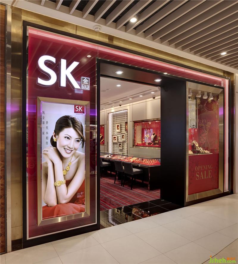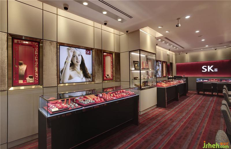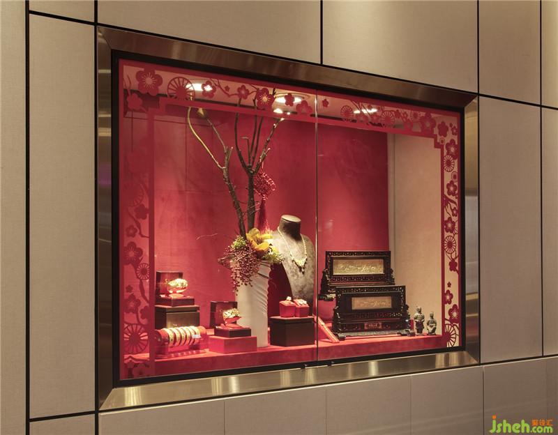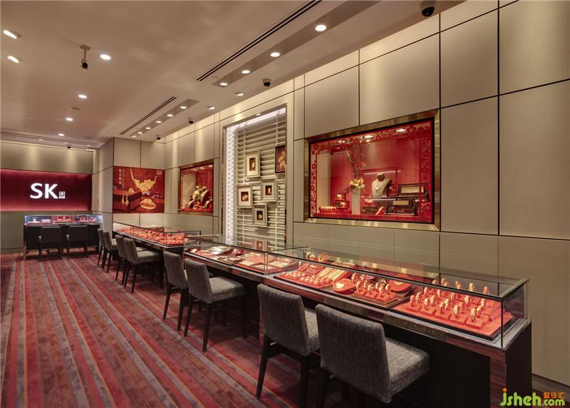 这是一个赋予传统黄金饰品店全新定义的设计。设计师致力于运用新颖的手法展现金饰的传统意义,大胆地大量采用抢眼的红色为基调,表达出炽热的情感和感官上的冲击,同时也衬托出耀眼的金饰在华人传统婚姻像征的重要地位。室内空间的墙面划分成了大小不一的板块,分别由各式的展示橱窗和产品海报组合而成。当中黑色的分隔线内敛地将各个板块分割开来,却又不会让人觉得唐突,让整个室内空间渗透出一丝丝有别于一般商店的气质,仿佛是一间富丽堂皇的艺术画廊。
