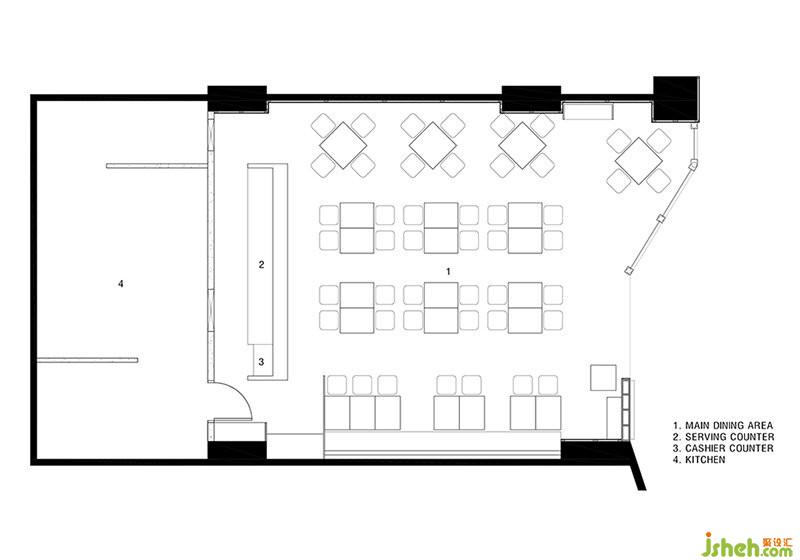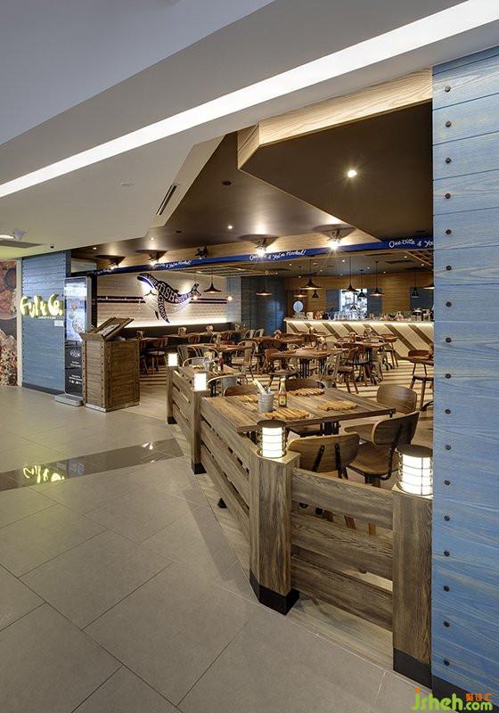 自觉身负着提供最新鲜渔获的使命,类似渔人码头的空间设计让食客对客户的品牌价值有更深刻的认同。渔夫的码头普遍被认为是渔船停靠和渔夫暂时堆积杂物的场所,新加坡SODA设计事务所重新将这个形象转换成可以即时品尝最新鲜海产的一种印象连接。半开放式的座位设计也让食客感受类似坐在码头旁边用餐边观察人流的一种趣致体验。