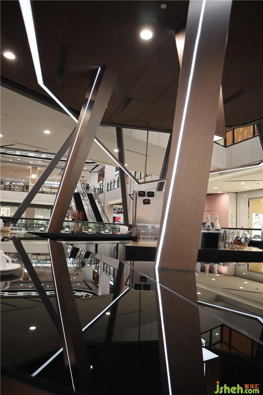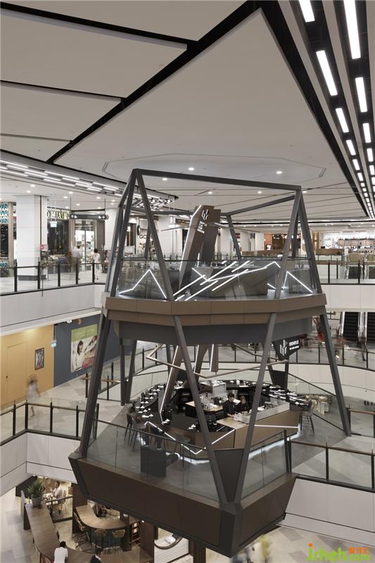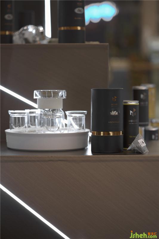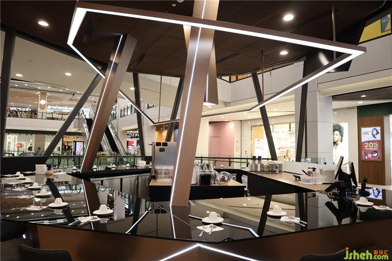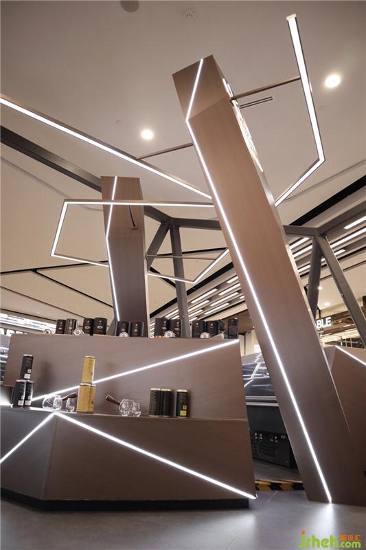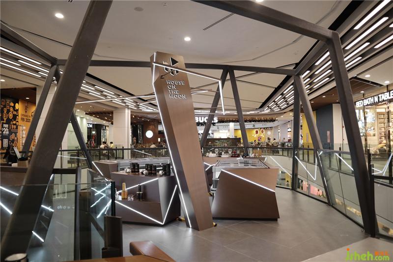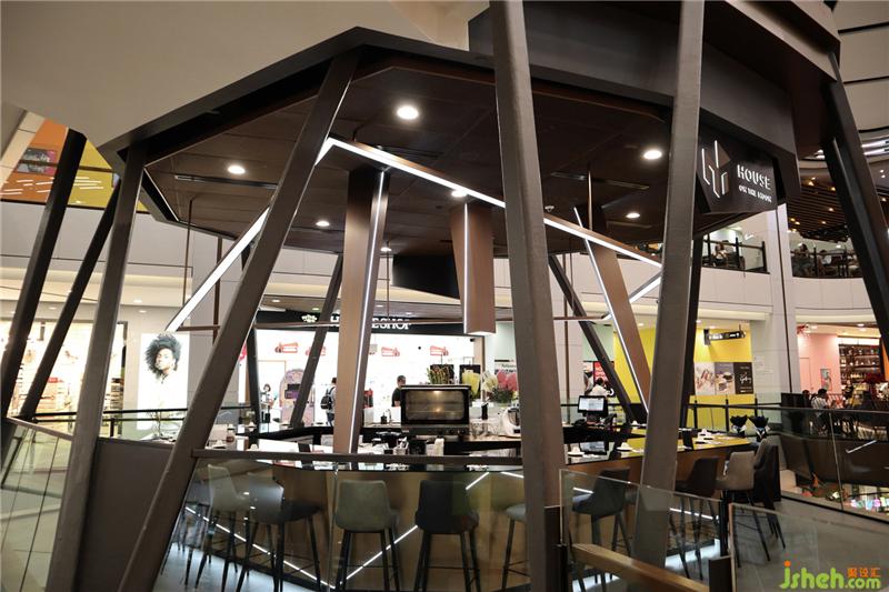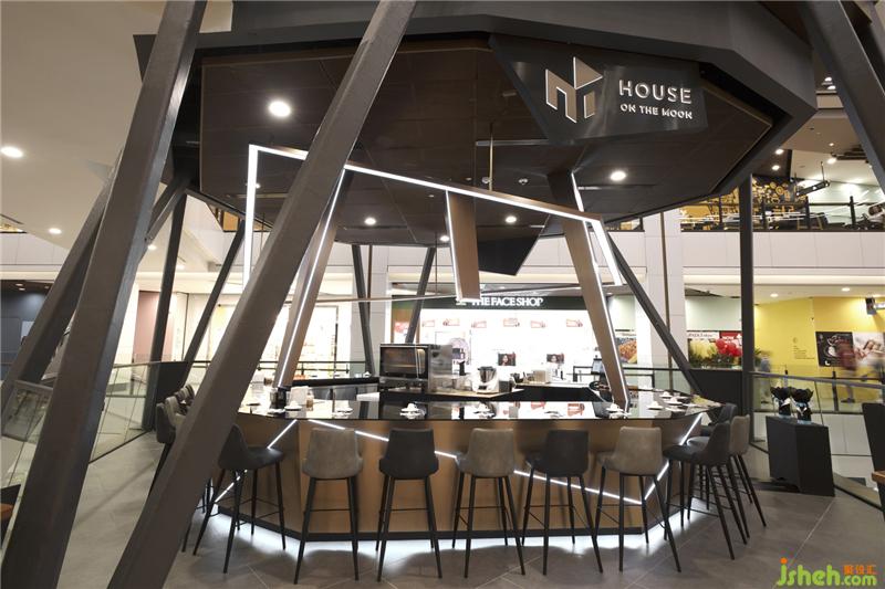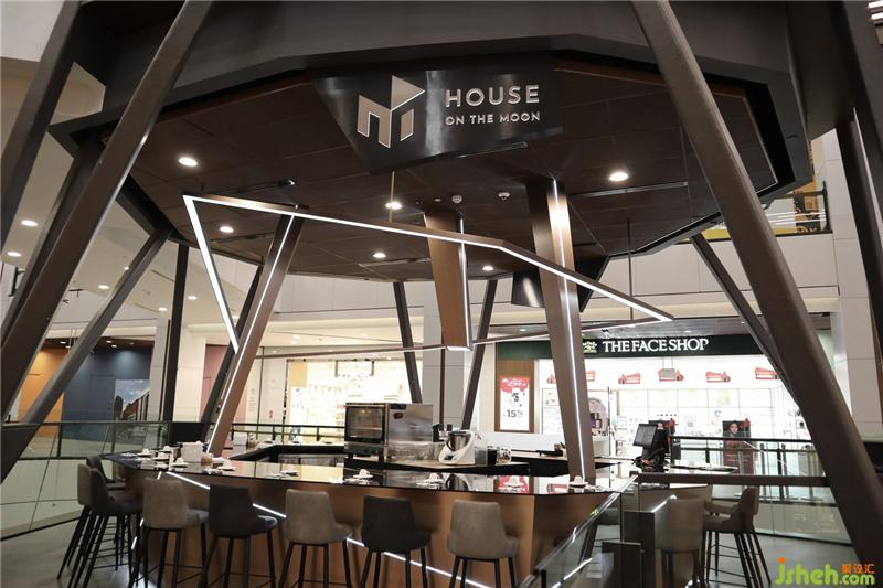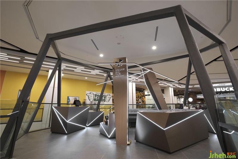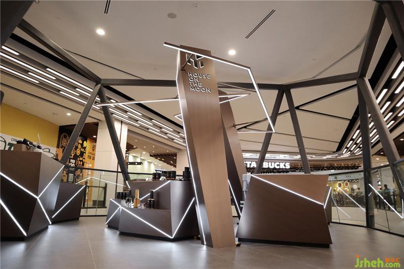 SODA的新旗舰店项目HOUSE ON THE MOON地处新加坡的GREAT WORLD商场内。该店是与米其林明星厨师Juan Amador及其门生Hüseyin Turan合作的项目,场地为一个双层单位。室内建筑设计灵感源于宇宙的反重力和不平衡性的特点,以及对该品牌文化本身的思考,我们将其转化为“多面化”和“多重倾斜角度”的设计概念。一楼定为用餐区域,二楼为商品零售区。在设计中我们将灯带装置做了多角度倾斜和翻转,通过插入双柱体来连接上下两层区域。