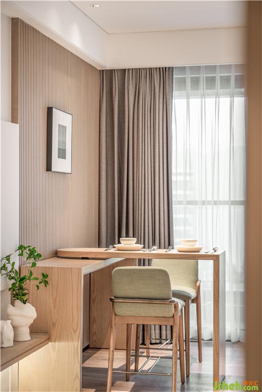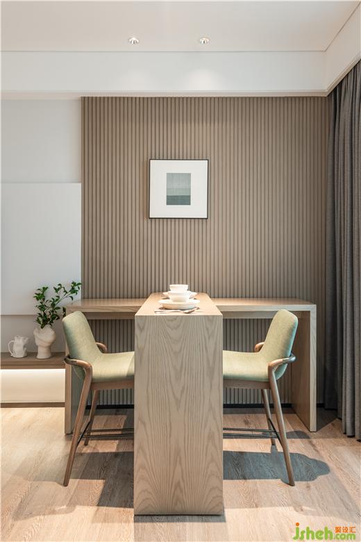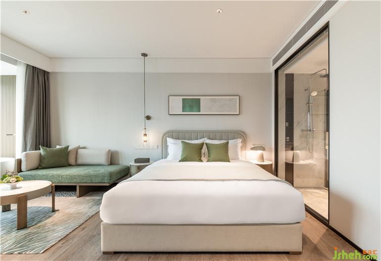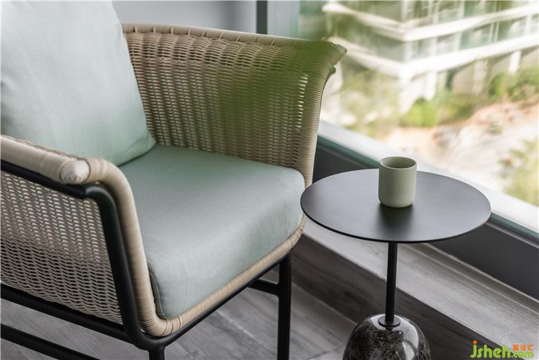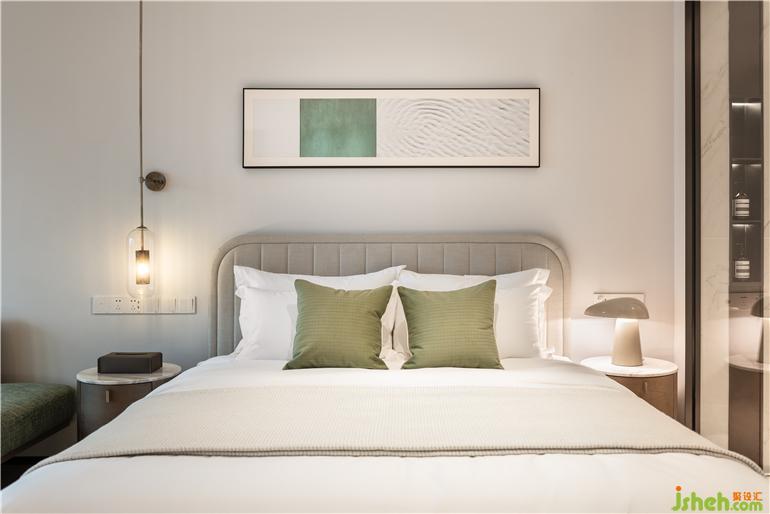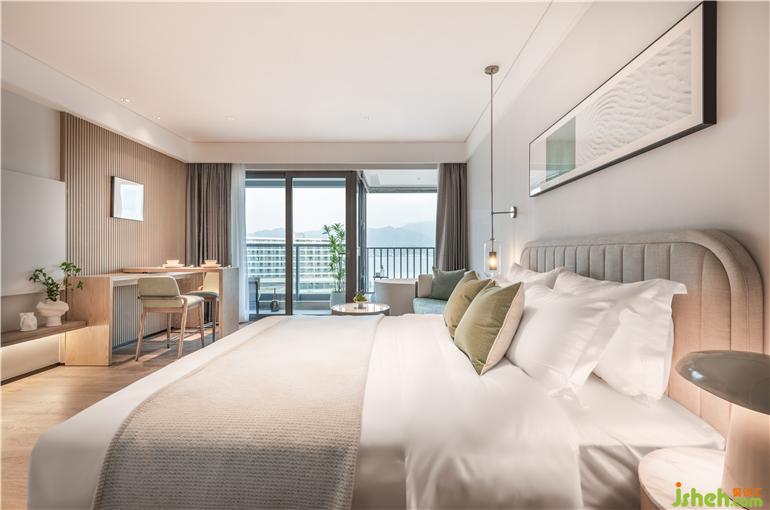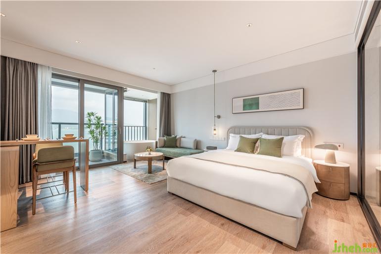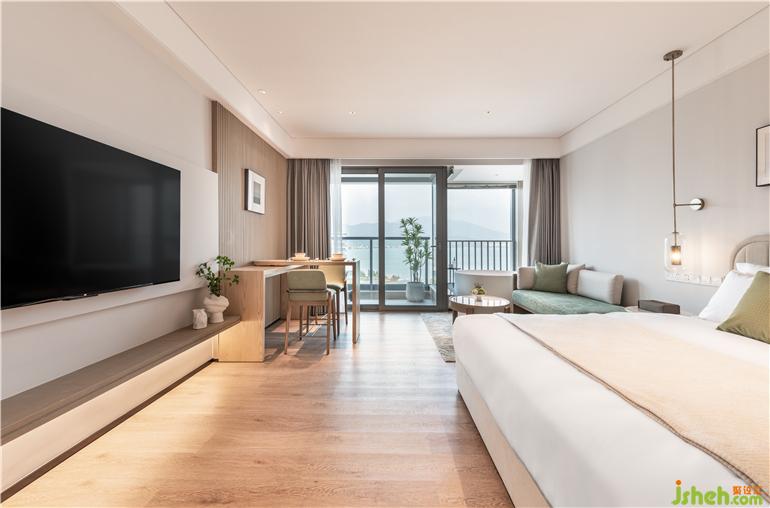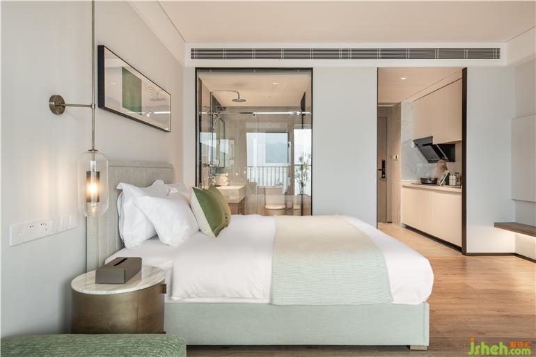 植物元素遍布整个样板房,窗帘“金叶环绕”,地毯如阳光下的斑驳树影,床毯以大鹏七娘山“七仙女”为灵感元素嵌入,酒店公寓设计整体空间将大鹏的传承过往一一呈现。